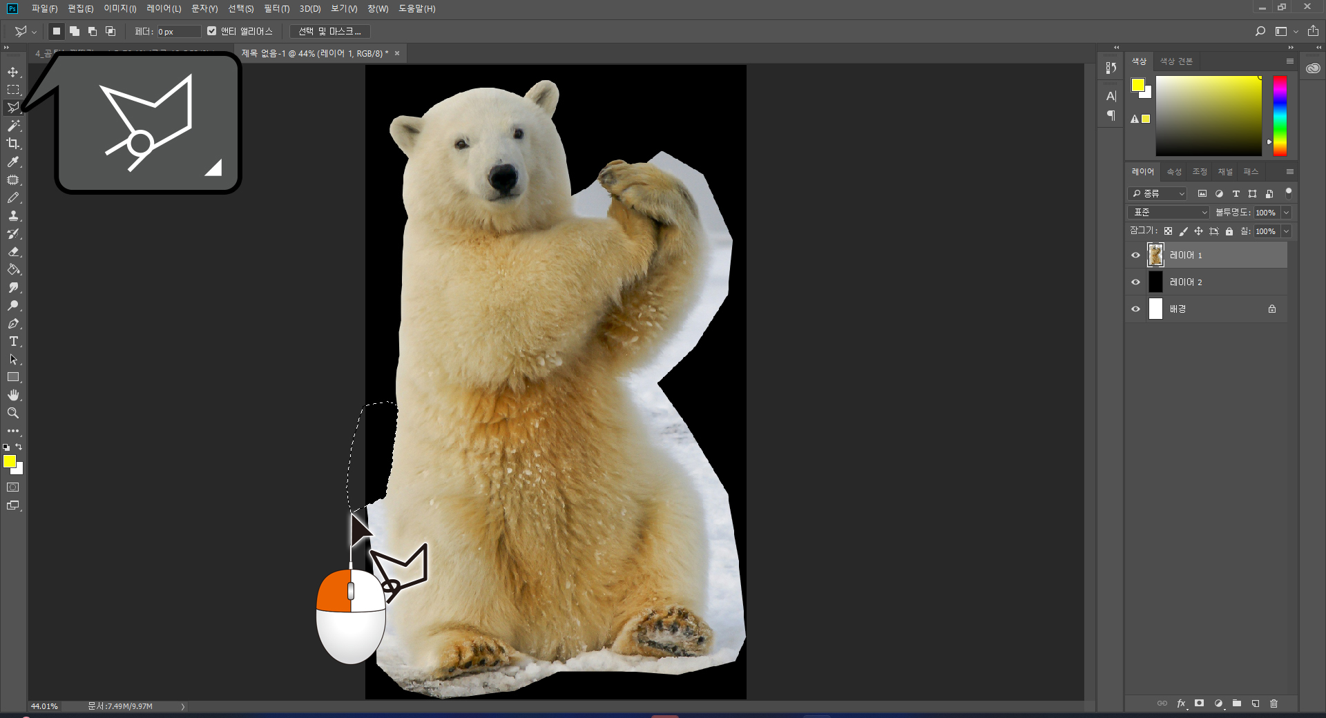 목적 이미지인 북극곰의 외곽을 따라가며 구간을 나눈 뒤, [다각형 올가미] 도구로 하나씩 지정해 배경을 단계적으로 제거합니다.