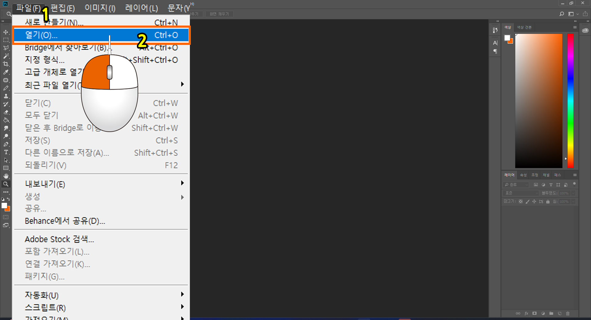 포토샵 [메인 메뉴바]에서 [파일] > [열기]를 누른 후. 열기 돌출창이 열리면 다운로드한 위치를 찾아 북극곰이미지. jpg를 좌측 마우스 버튼을 이용하여 두 번 연속(더블 클릭) 누르거나, 한번 눌러 지정 후. 우측 하단에 위치한 [열기] 버튼을 눌러 시작합니다.