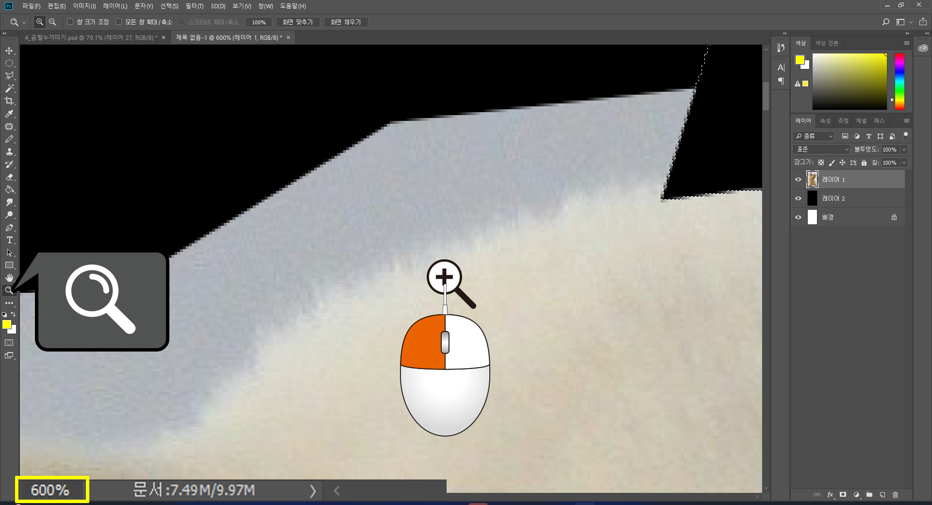 참고로 작업에 앞서 [툴박스]에 위치한 [돋보기] 도구를 이용하거나, 화면 하단에 표시된 화면 크기 조절 기능에 키보드 자판을 이용하여 목적 이미지를 충분히 살펴볼 수 있습니다. 눈이 불편하지 않을 정도로 화면을 확대하여 작업하시면 작업 능률과 효율이 함께 증가합니다.