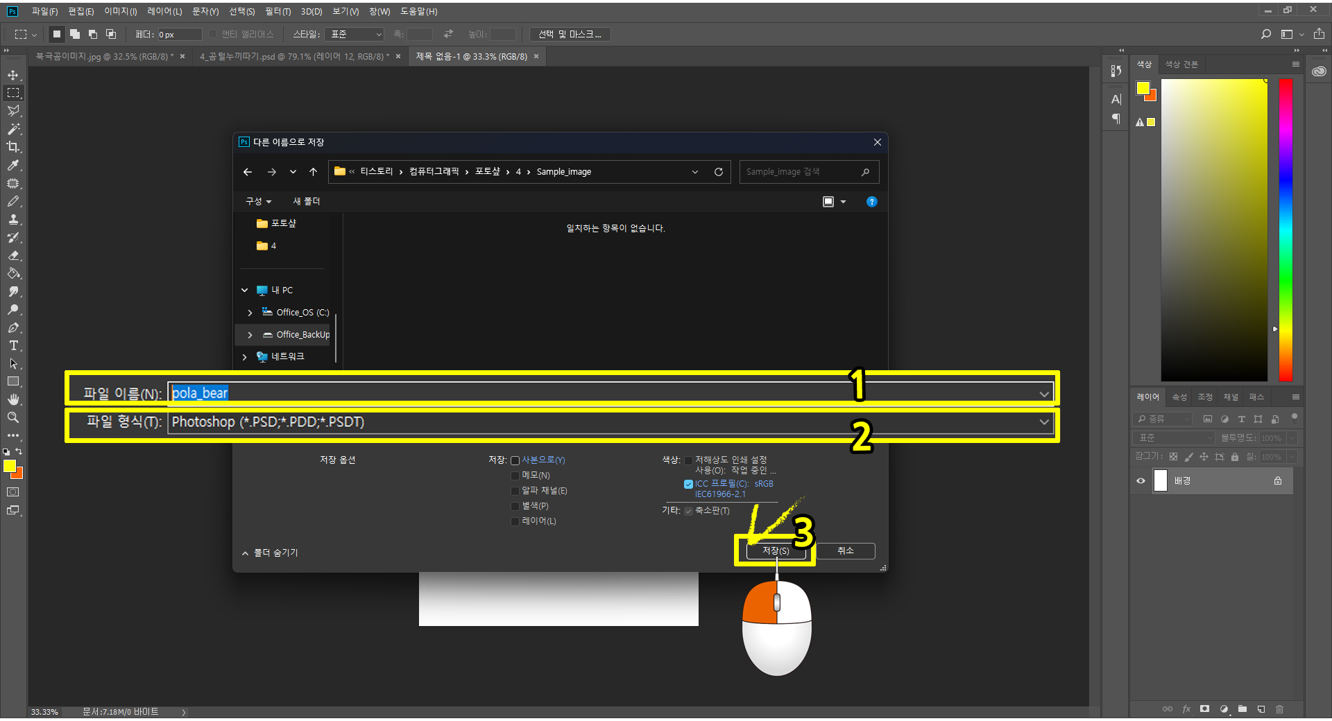 모든 단계마다 작업이 끝나면 파일을 꼭 저장 합니다. 간혹 긴 작업을 할 경우. 중간, 중간에 저장하는 습관을 갖는게 좋습니다.