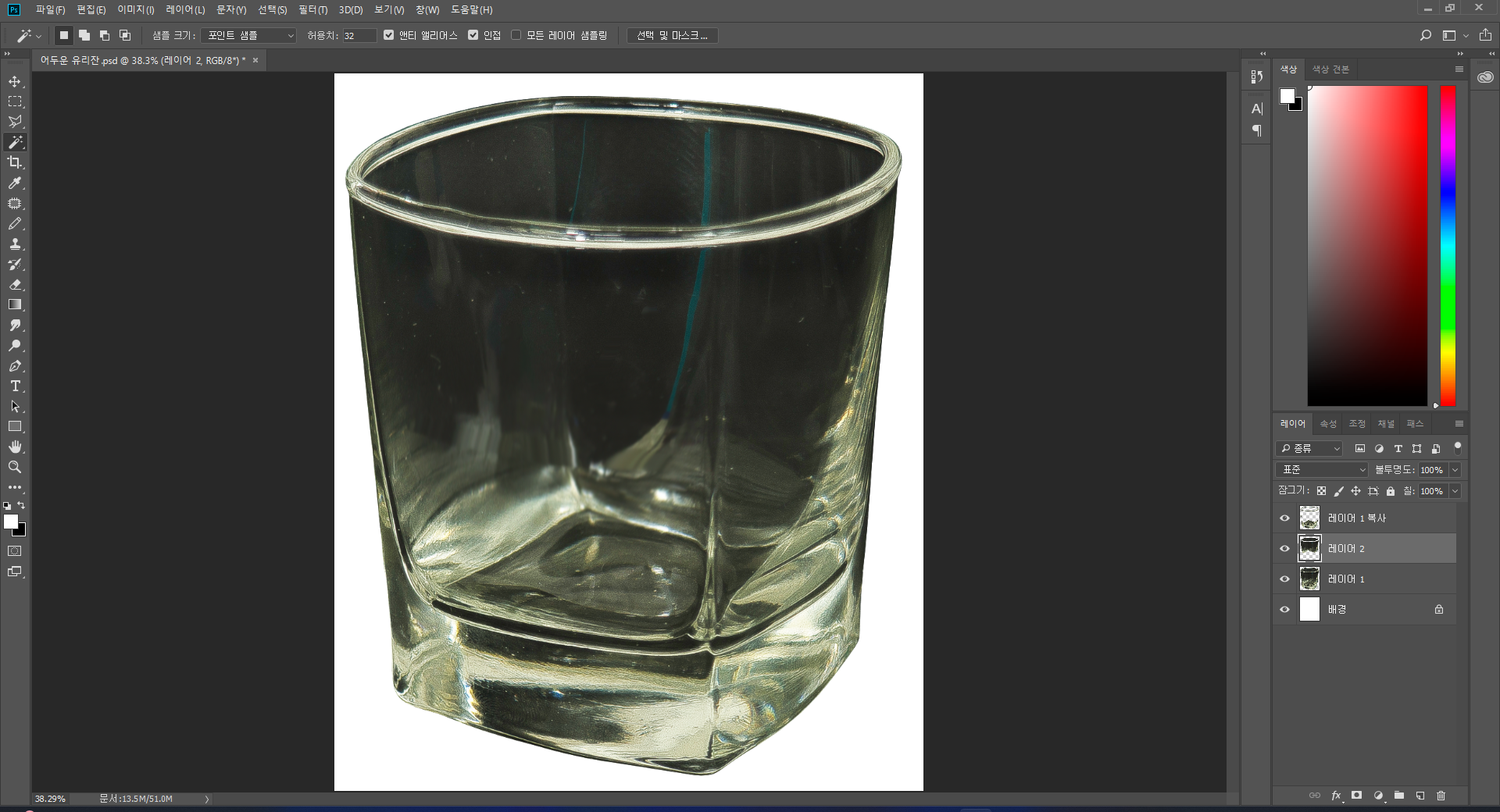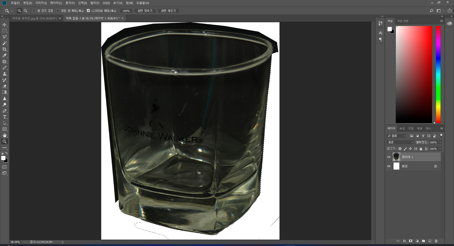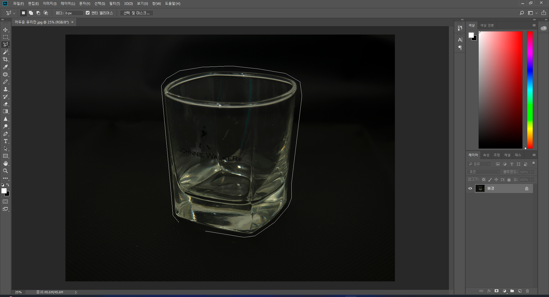 - 유리잔 이미지를 불러온 후, 초벌 누끼와 세밀한 누끼 작업을 통해 배경 제거를 진행합니다.