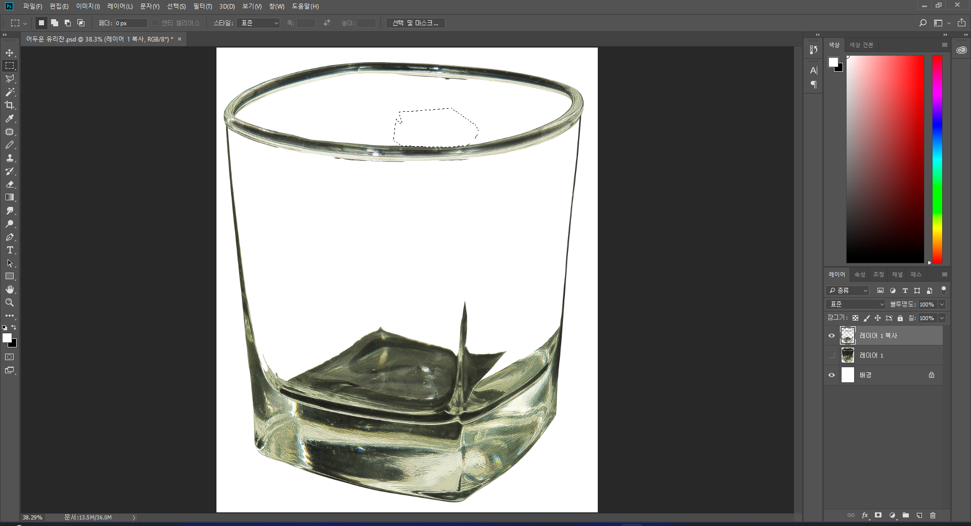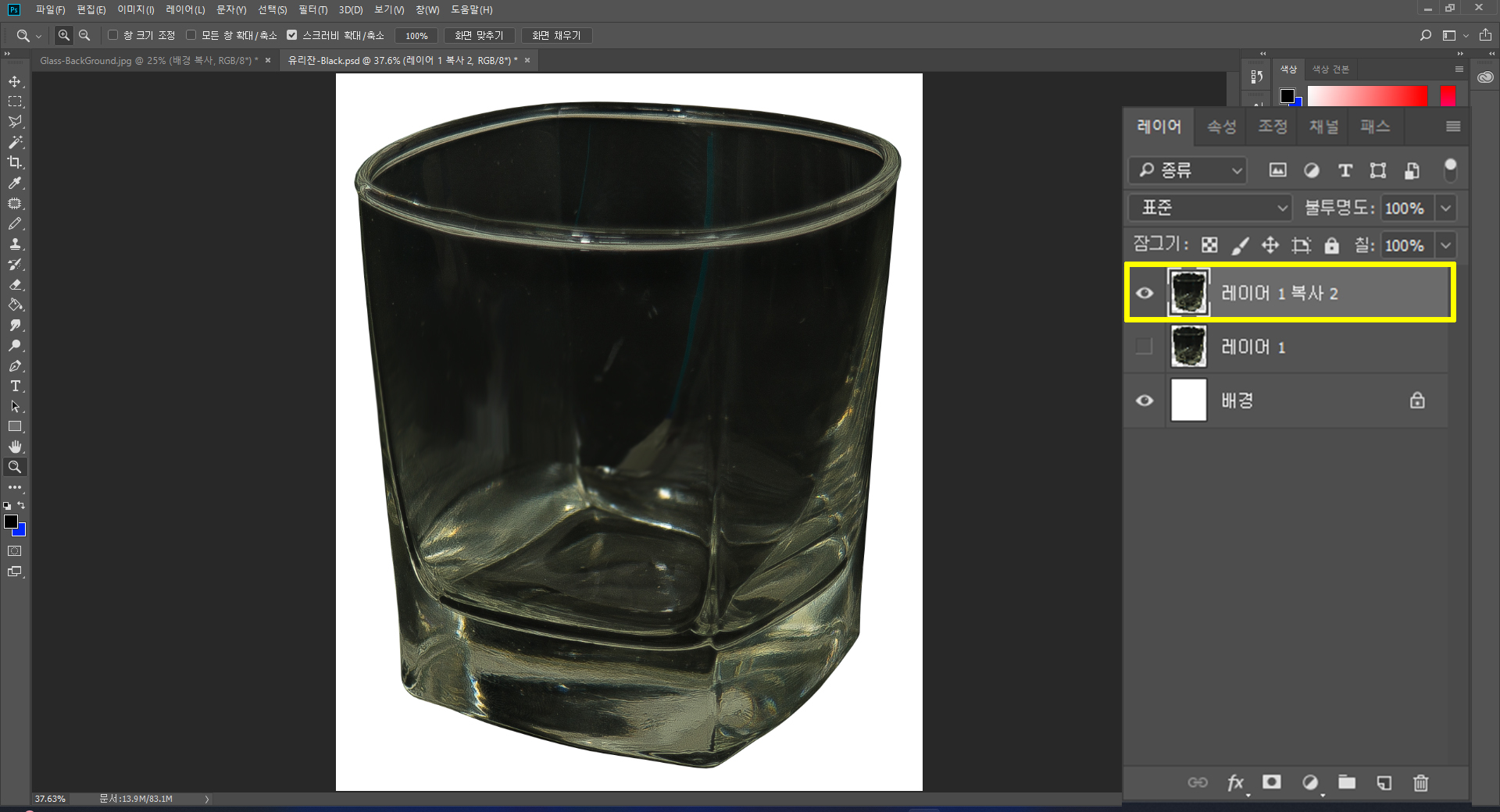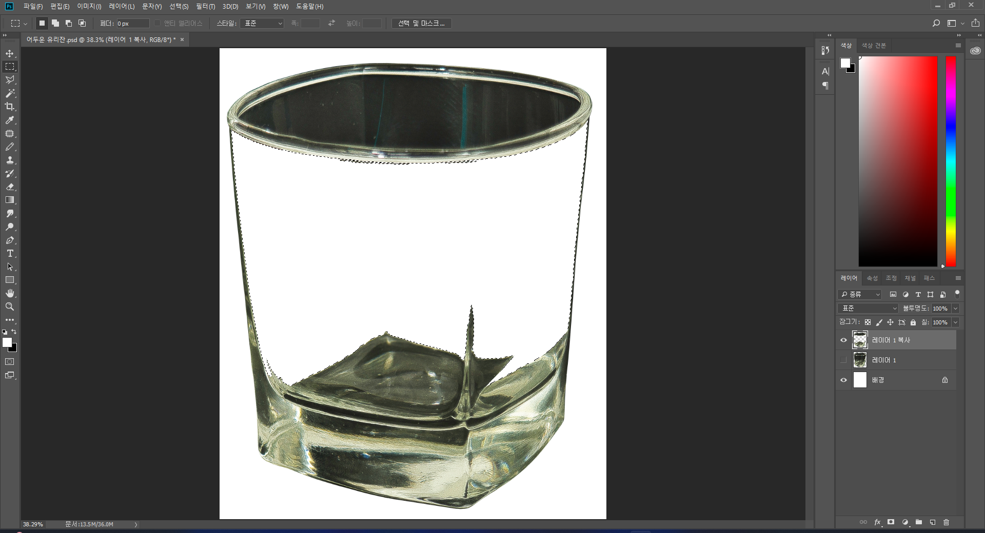 먼저 배경이 제거된 유리잔 이미지 레이어를 복사합니다. 복사된 이미지를 자세히 관찰하여 아래의 이미지와 같이 두께별로 영역을 구분합니다.