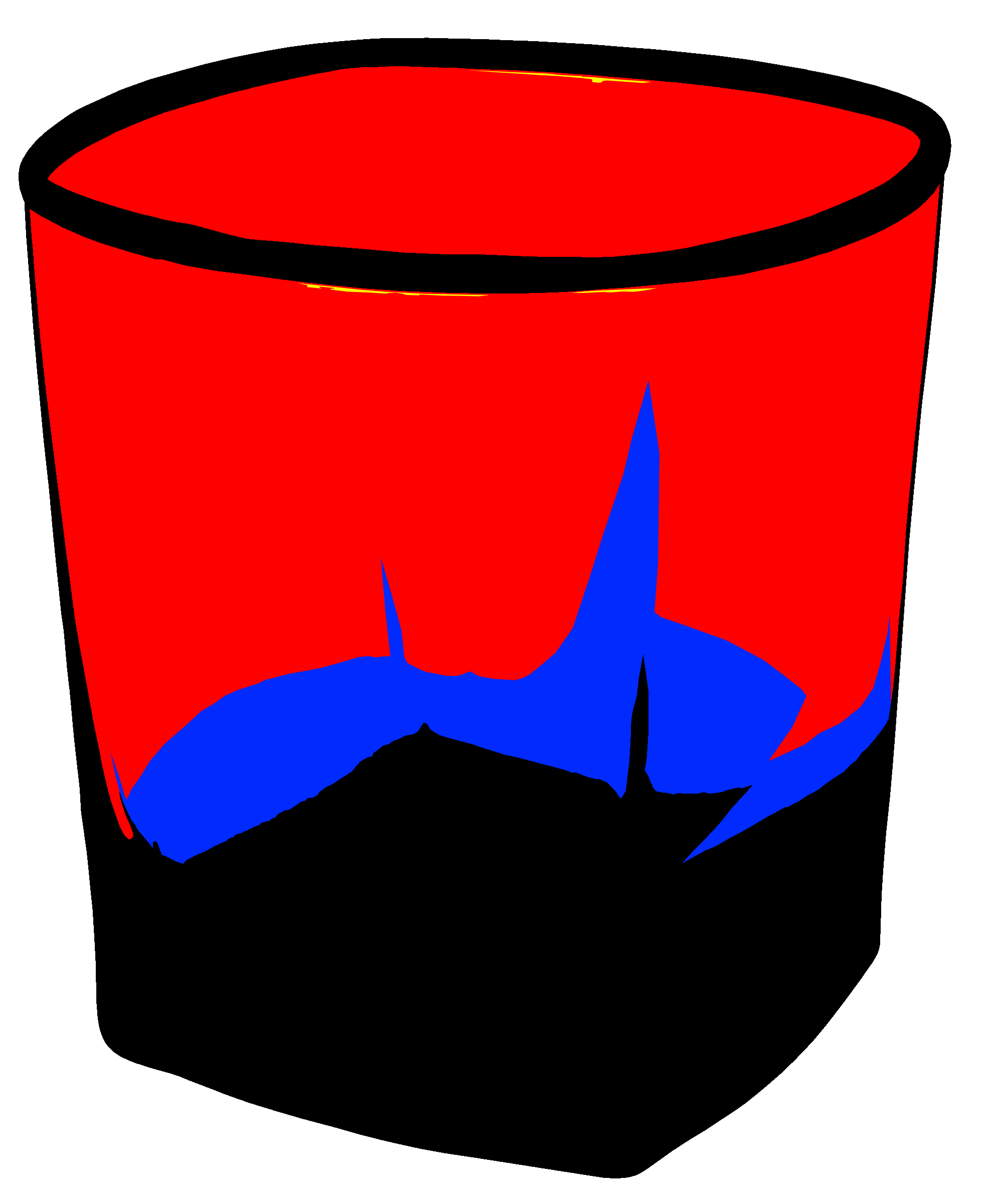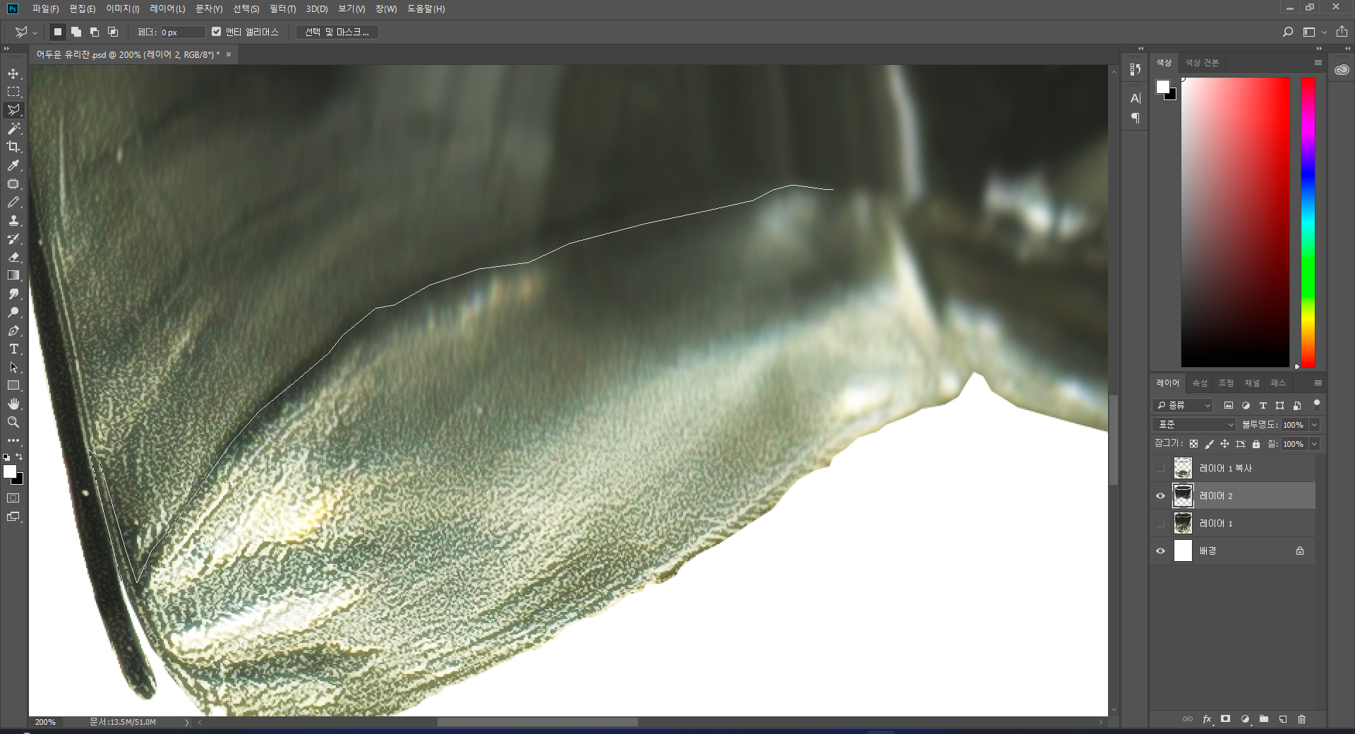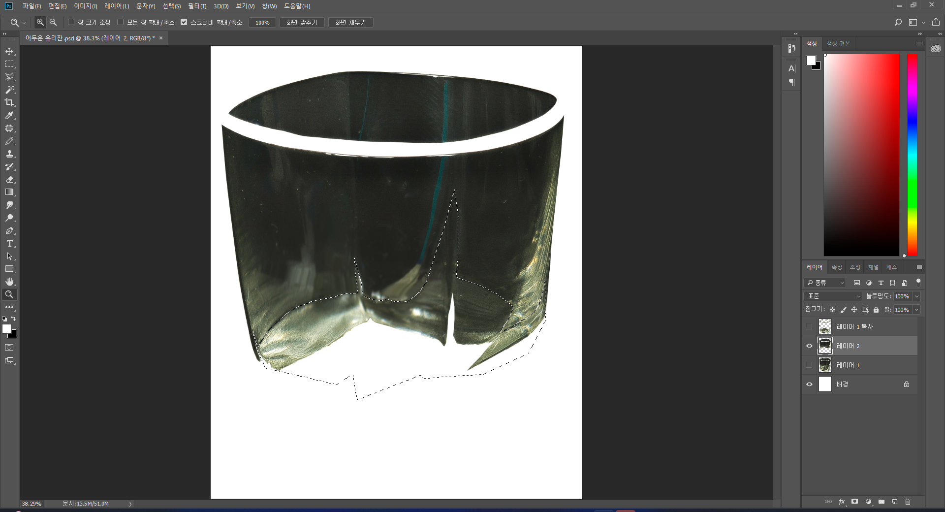 먼저 배경이 제거된 유리잔 이미지 레이어를 복사합니다. 복사된 이미지를 자세히 관찰하여 아래의 이미지와 같이 두께별로 영역을 구분합니다.