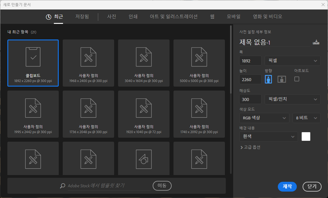 [메인 메뉴바]에 [파일]로 들어가 [새로 만들기]를 선택한 후. 맨앞에 나타난 클립보드를 선택, [제작]을 클릭 합니다.