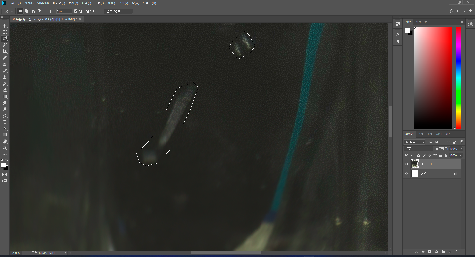 이번 페이지는 앞선 페이지들과는 달리 기본적인 도구 사용법에 대한 설명은 제외하고 진행합니다. ‘좌측 마우스 버튼을 눌러 줍니다’와 '[ctrl]+[C], [ctrl]+[V]' 같은 초보 단계의 동작 설명은 생략하며, 투명 물체 표현을 위한 선택과 판단의 과정에 집중하겠습니다.