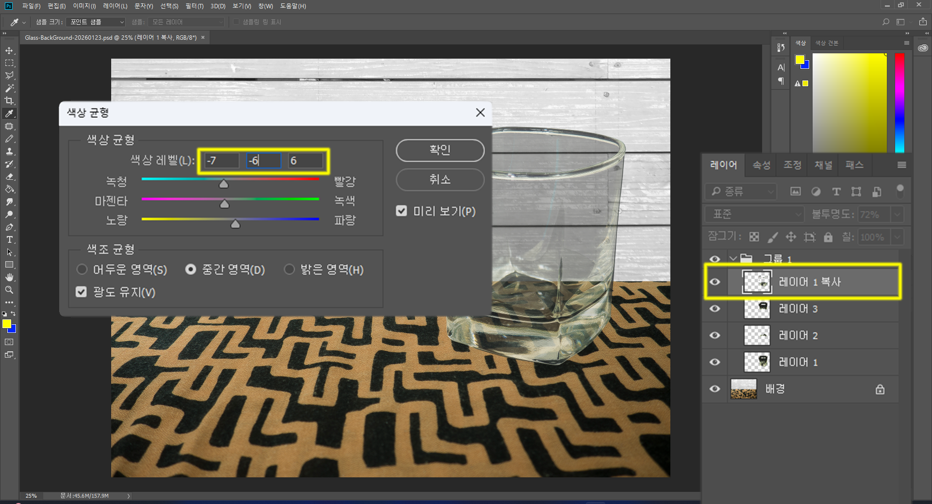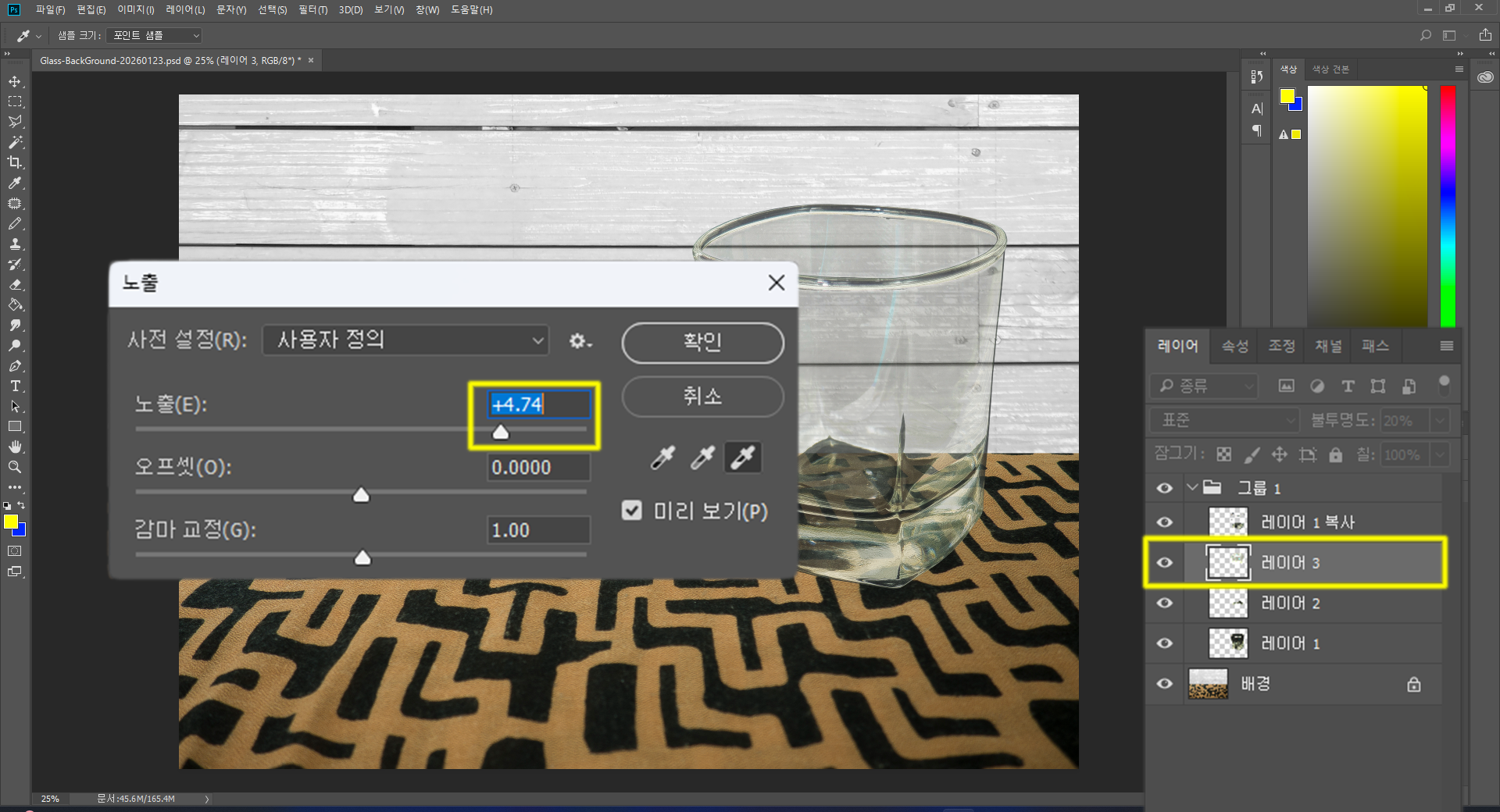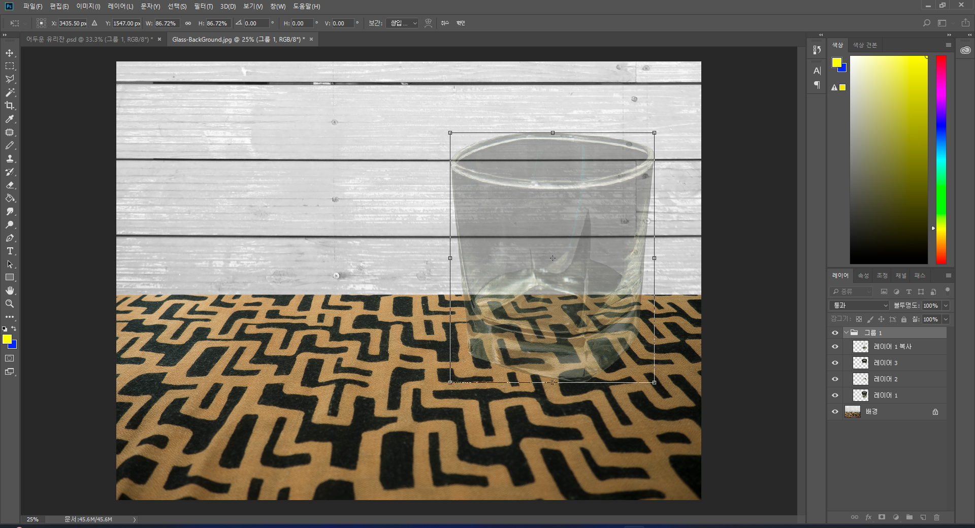 그래도 어딘가 부자연스럽게 느껴질 경우. 원본 유리잔의 투명도를 낮추거나, 높여 재설정하여 줍니다.