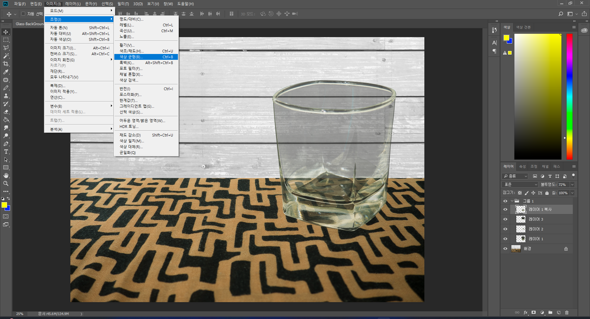 작업자의 모니터 환경이나 그래픽 카드 설정에 따라 유리잔이 조금 어둡거나 붉게 보일 수 있습니다. 이럴 때는 아래의 과정을 통해 내 눈에 가장 자연스러운 상태로 미세 조절을 해줍니다. 이 작업은 정해진 답이 없으므로, 원하시는 분들만 선택적으로 진행하시면 됩니다.
