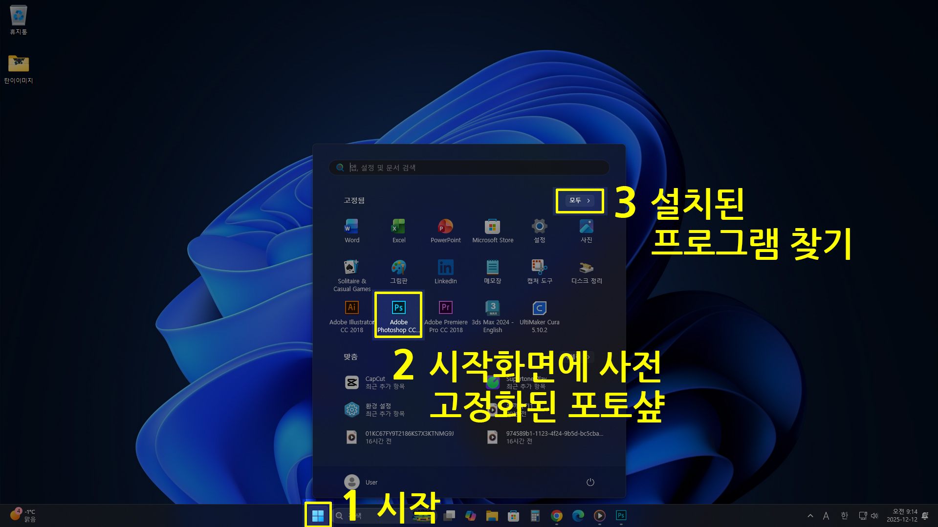 2. 포토샾 아이콘을 시작화면에 고정한 경우. [포토샵 아이콘] 바로 클릭