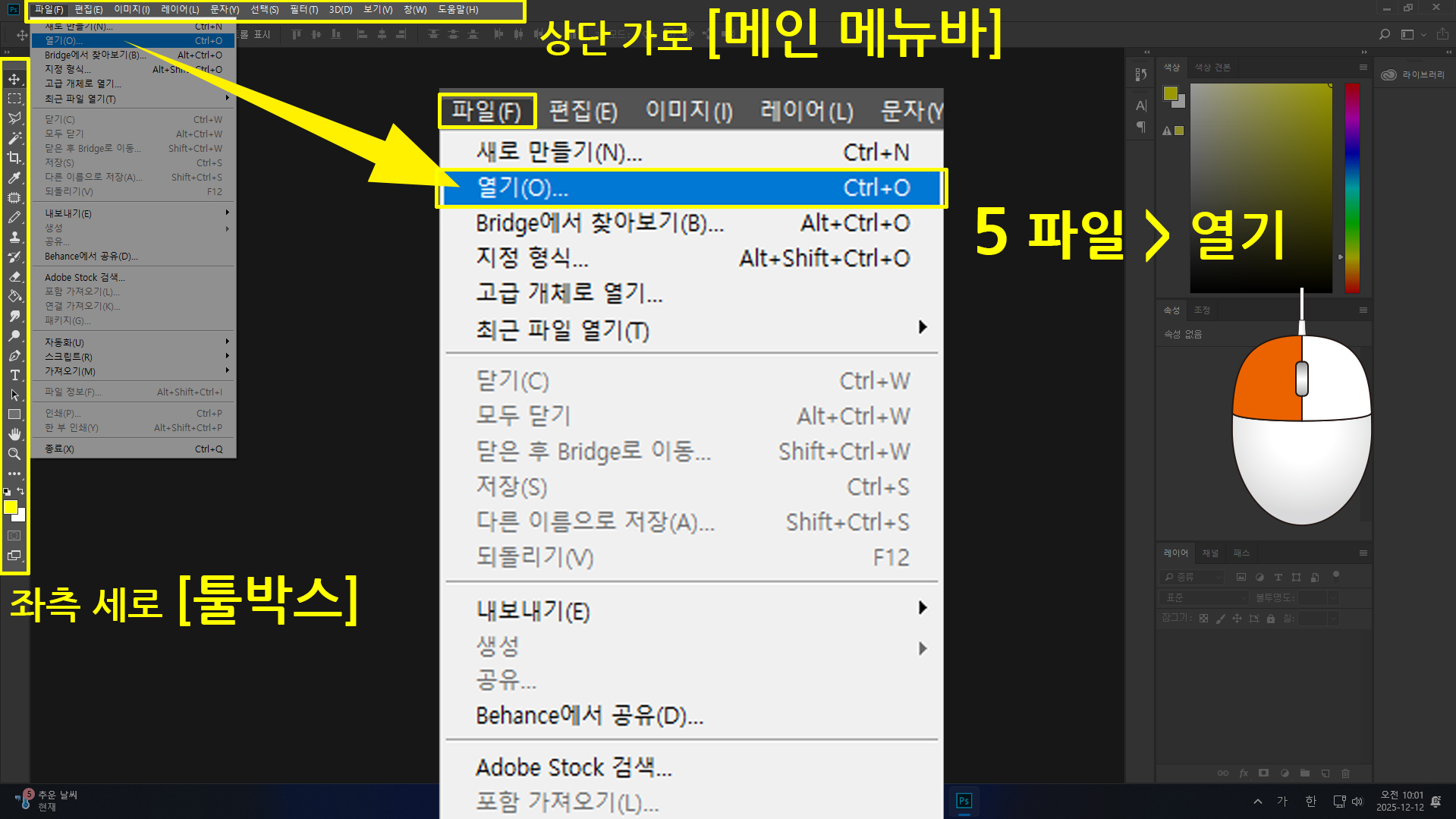 5. 상단 가로 [메인 메뉴바]에 [파일] > [열기]를 클릭합니다.