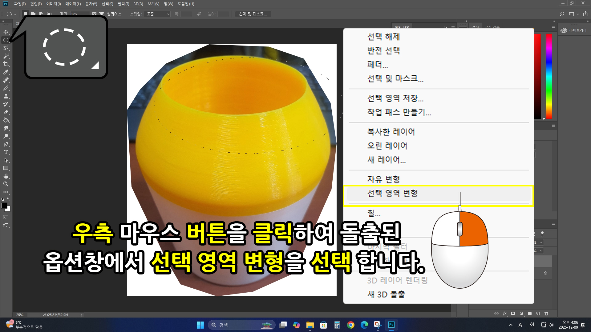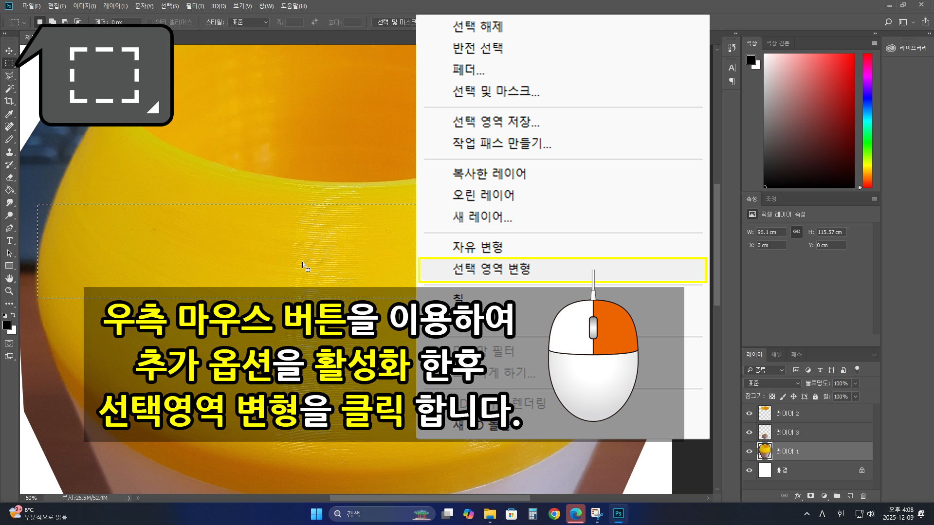 [우측 마우스를 클릭]하여 추가 옵션창을 돌출하고 옵션 중에 [선택 영역 변형]을 선택합니다.