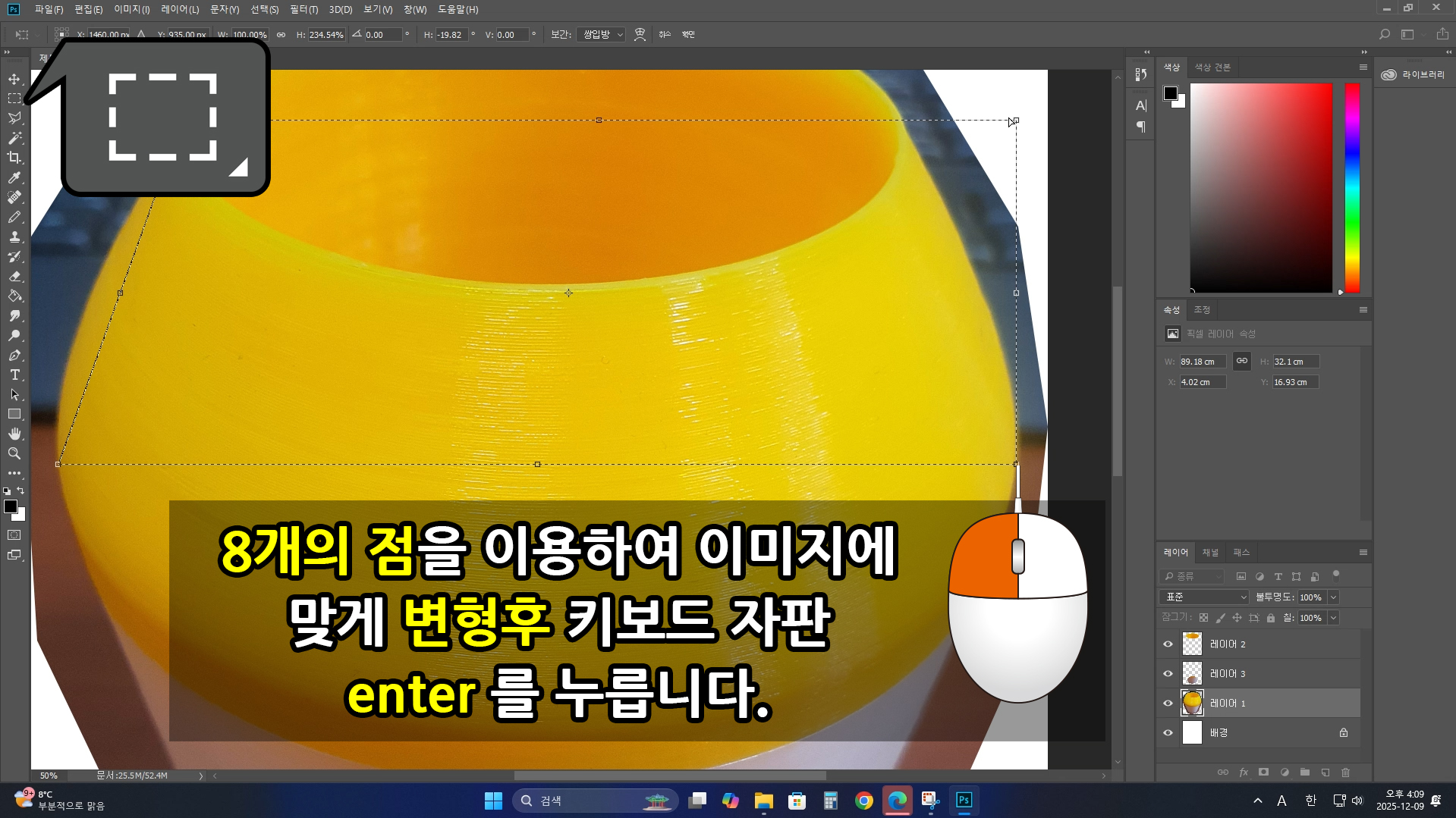 앞서 안내한 내용과 같이 8개의 점을 이용하여 이미지에 맞게 변형한 후. 키보드의 [enter] 눌러 [선택 영역 변형] 기능에서 벗어납니다.