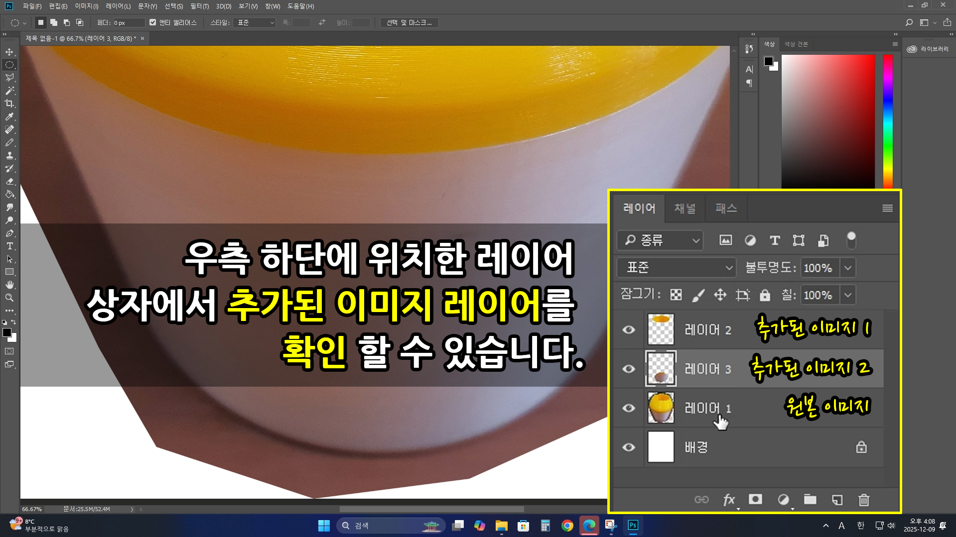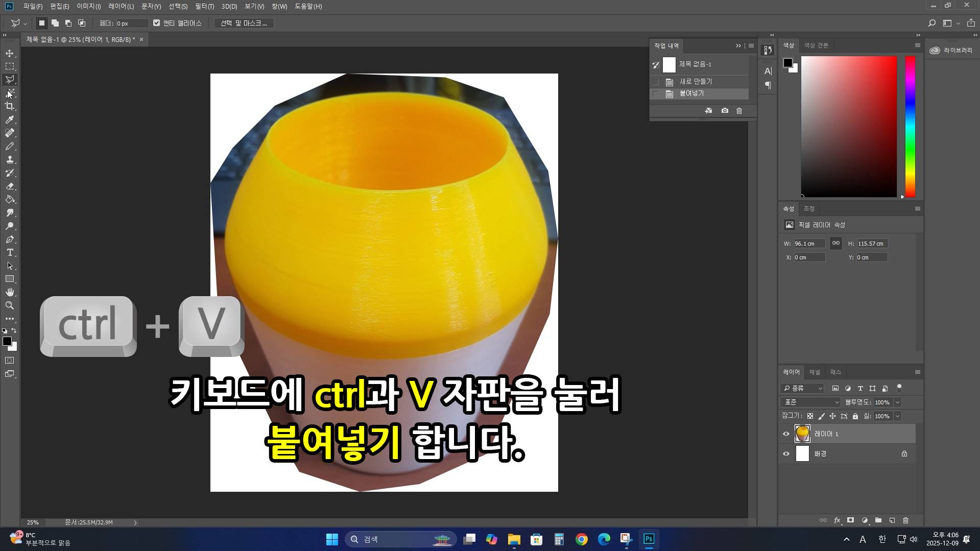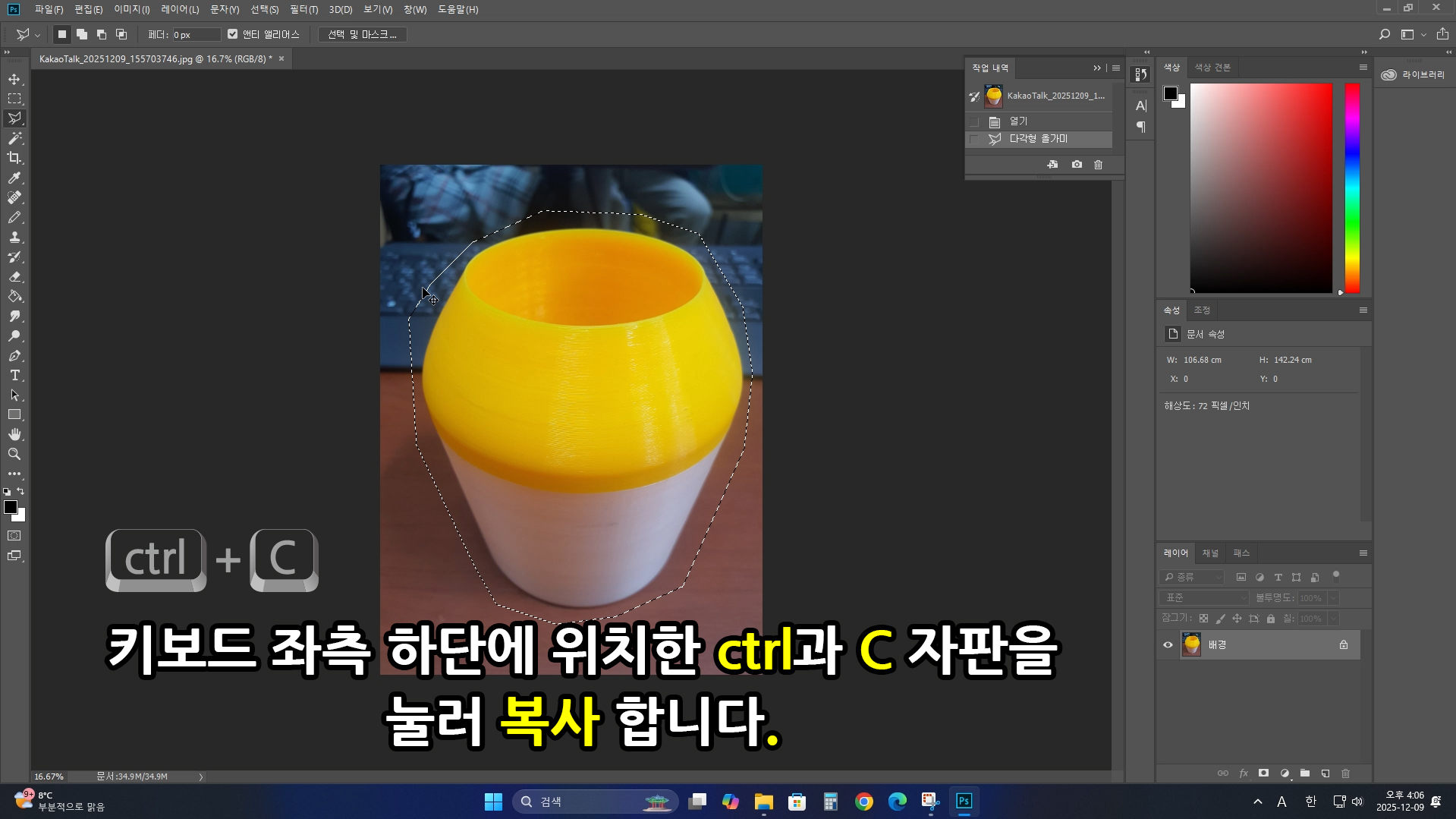 올가미를 마무리한 후. 앞서 전달한 내용과 같이 키보드 자판에 복사하기 [ctrl+C], 붙여 넣기 [ctrl+V]를 눌러 아까 확보하지 못한 이미지 레이어를 추가 확보 합니다.