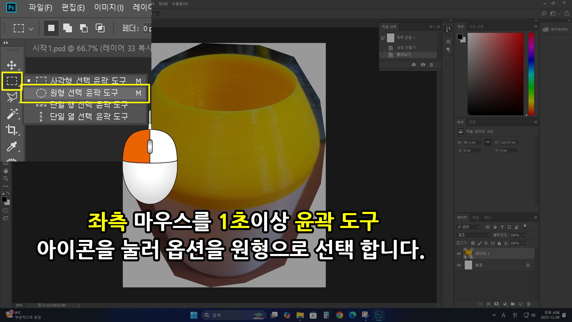 좌측세로 [툴박스]에서 [윤곽 도구]를 [좌측 마우스로 1초 이상] 누르면 [추가 옵션](기능) 창이 나옵니다. 이때 [원형 선택 윤곽 도구]를 선택합니다.