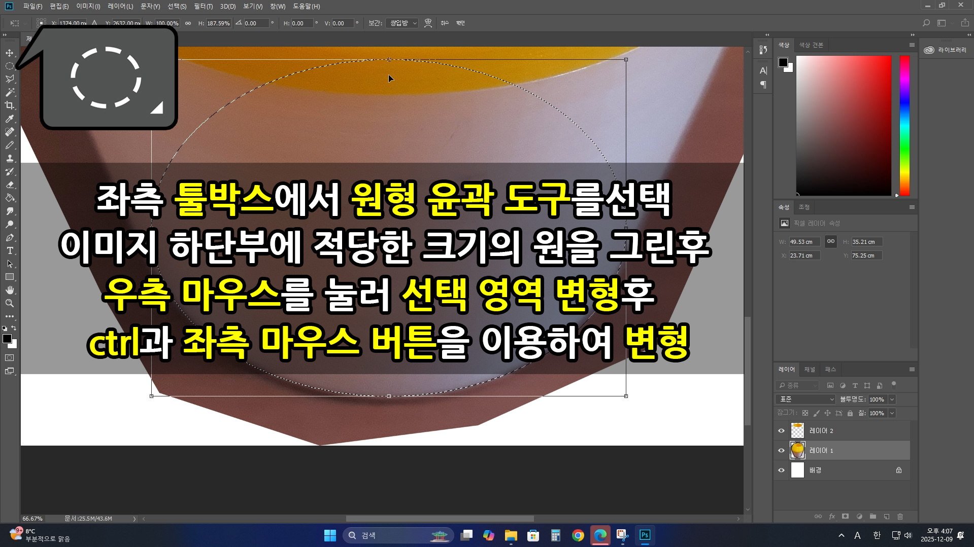 다시 레이어 상자에서 원본레이어를 선택하고, [원형 선택 윤곽 도구]를 이용하여 이미지 하단부에 원형의 영역을 선택합니다.