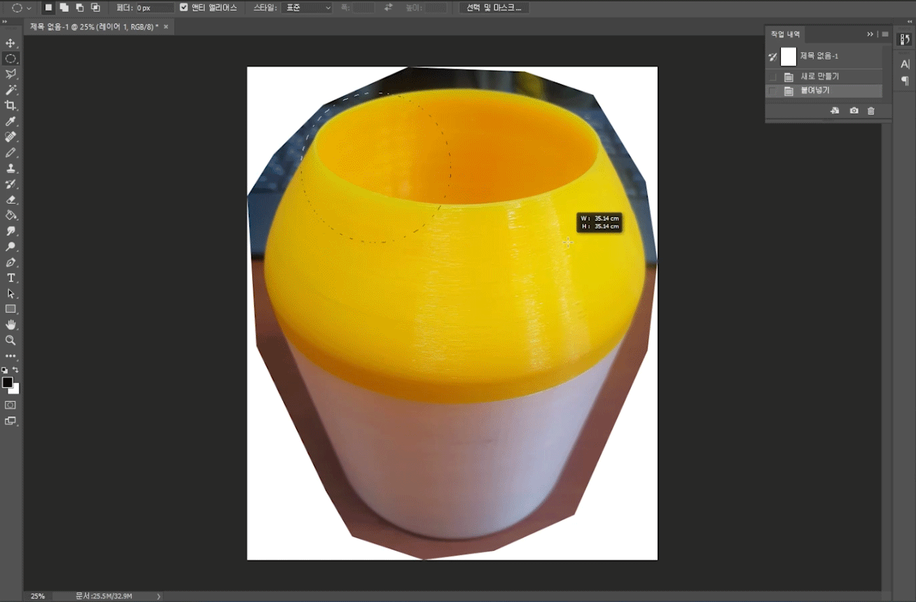 앞서 안내한 내용과 같이 좌측 세로 툴박스에서 [윤곽 선택] 아이콘을 선택한 후 원본 이미지 하단부에 원형부 이미지에 적당히 맞게 원을 그려 줍니다. 이후 우측 마우스를 클릭하여 [선택 영역 변형]을 선택하고[8개]의 점을 이용하여 이미지에 맞게 조절한 후. 키보드의 [enter] 눌러 [선택 영역 변형] 기능에서 벗어납니다.