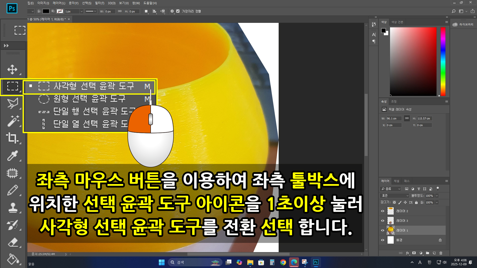 좌측 세로 [툴박스]에서 [선택 윤곽 도구]를 1초 이상 눌러 옵션을 [원형 선택 윤곽 도구]에서 [사각 선택 윤곽 도구]로 변환합니다.
