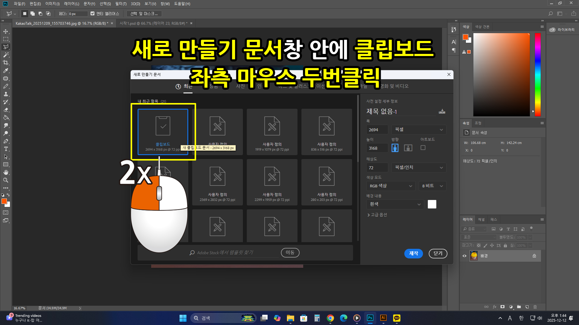새로 생성된 배경창에 키보드 [Ctrl+V]를 눌러 붙여 넣기 합니다. (선택사항: 더 이상 원본 파일창은 불필요하니 창을 닫아도 좋습니다.)
