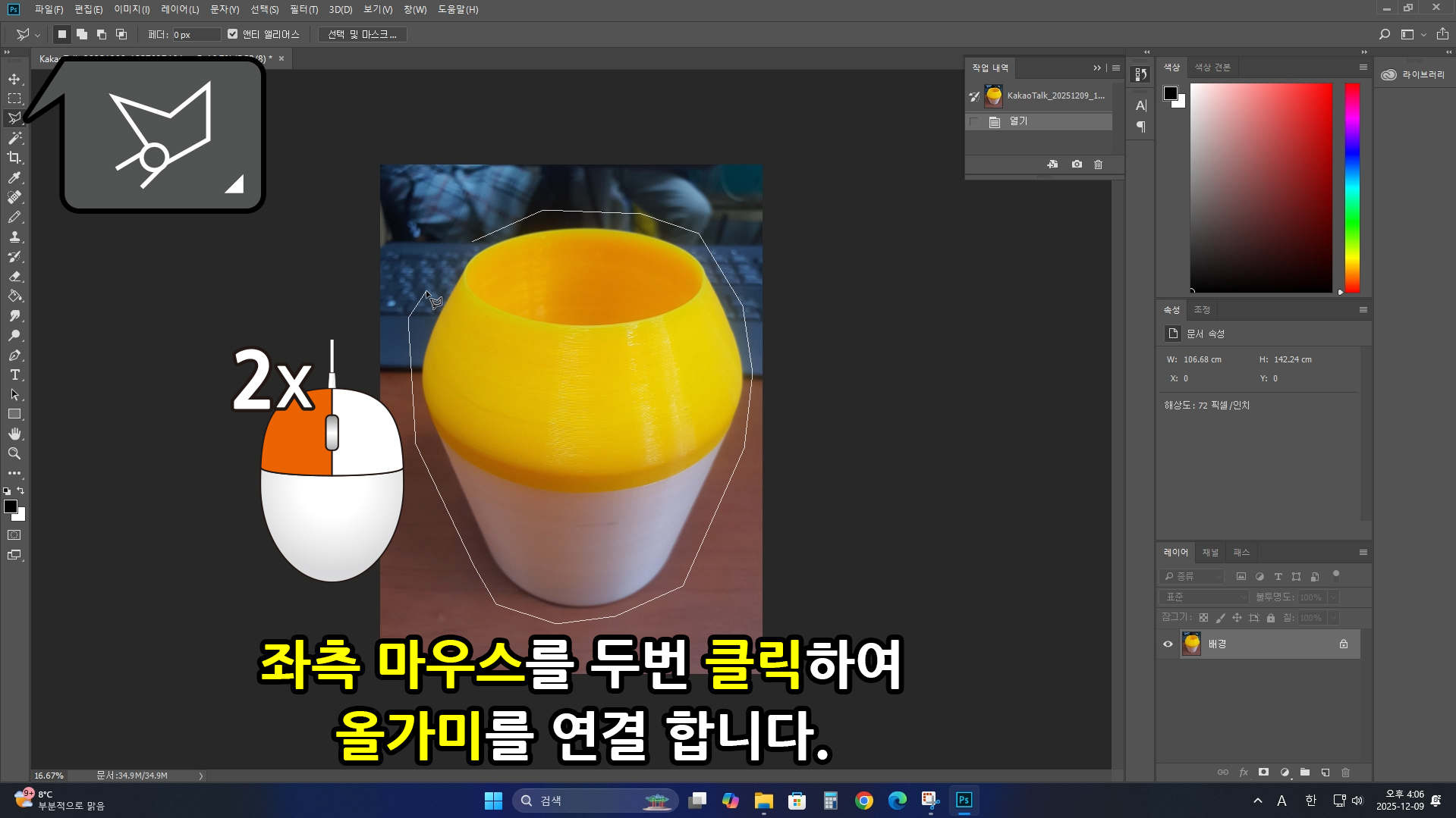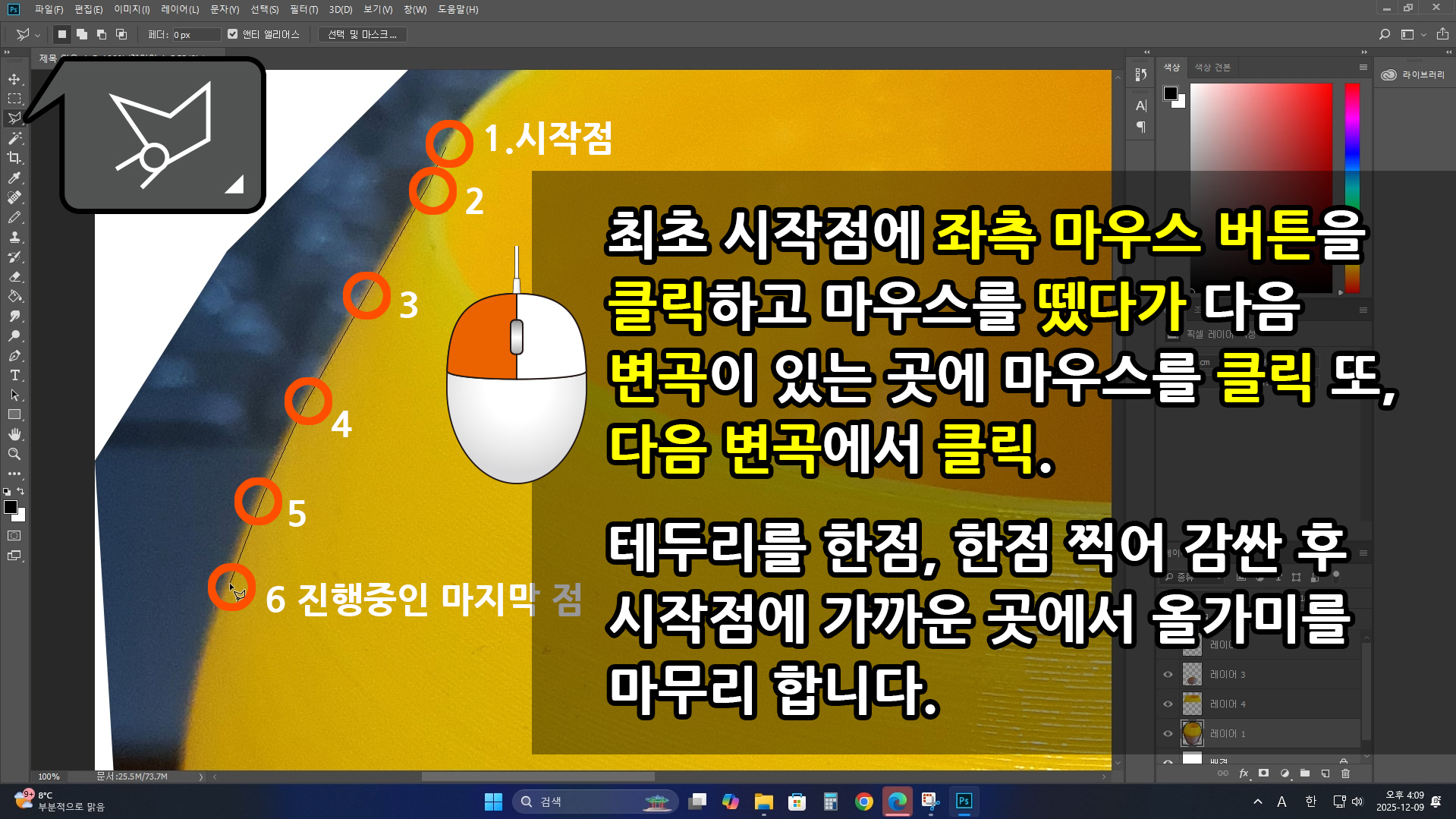 마무리로 [좌측 마우스를 두 번 클릭]하여 올가미를 연결합니다. 또는 다각형 올가미의 [시작점에 맞춰 좌측 마우스를 한번 클릭] 합니다.