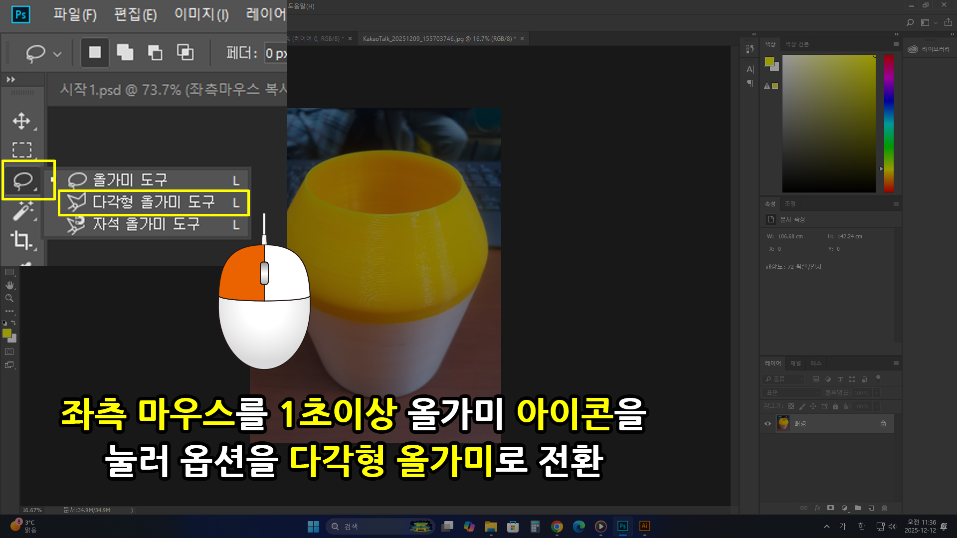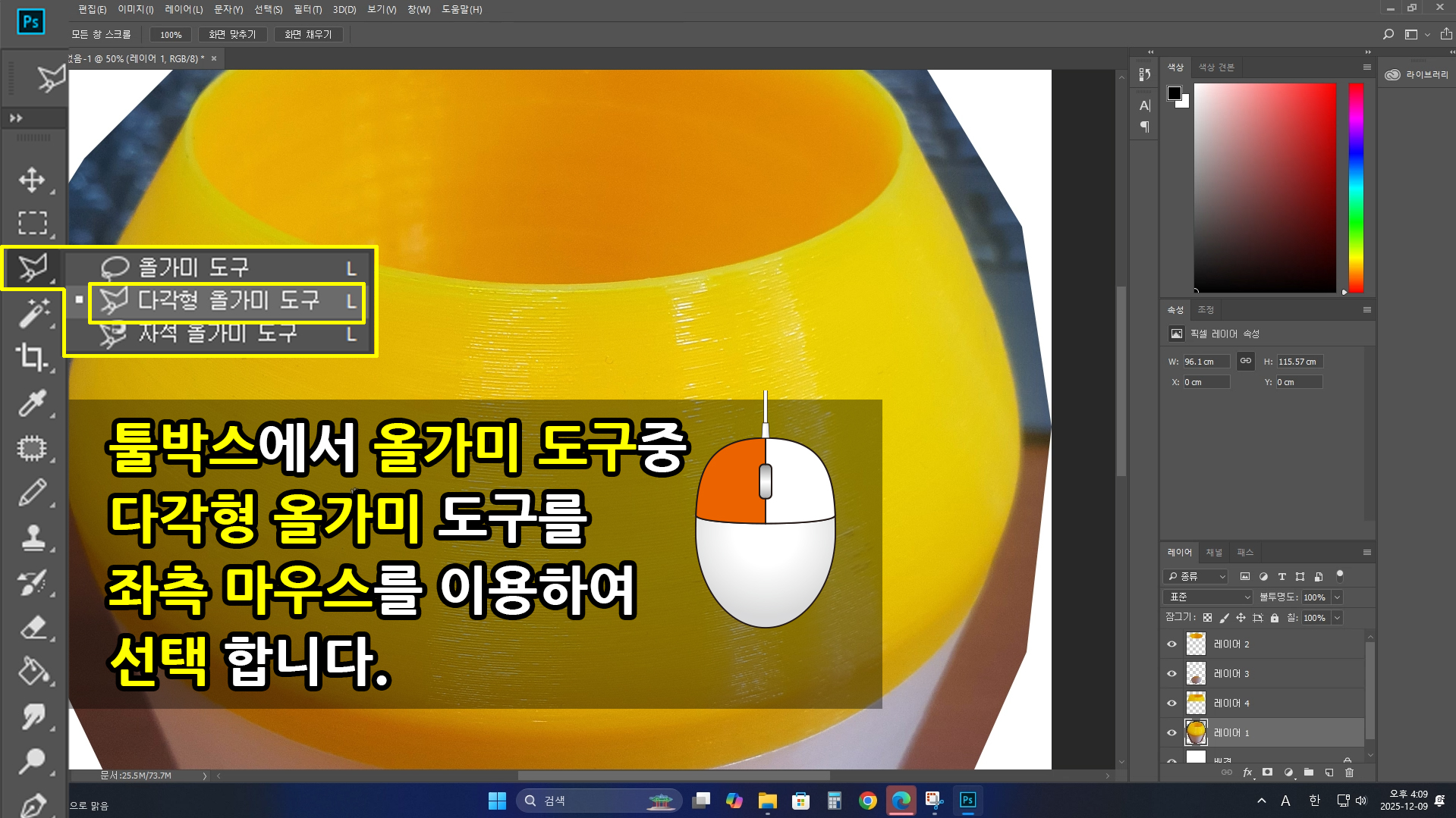 좌측 세로 [툴박스]에서 올가미 아이콘을 1초 이상 눌러 옵션을 [다각형 올가미 도구]로 선택합니다.