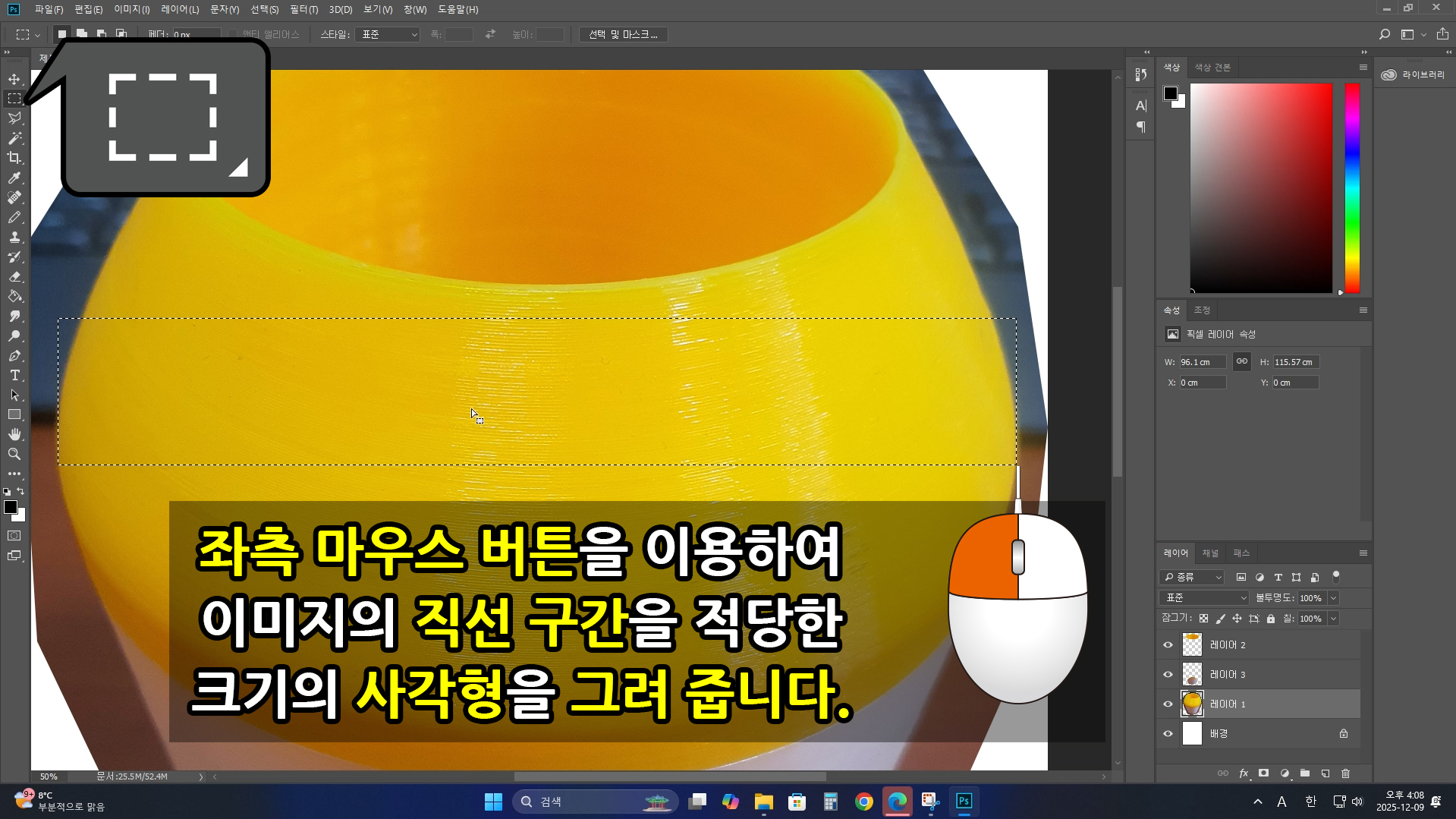 이번엔 아까와 달리 [사각 선택 윤곽 도구]를 이용하도록 하겠습니다. 사실 이런 경우. [사각 선택 윤각 도구]를 사용할 이유는 없습니다. 다만 교육 목적으로 이용하겠습니다.