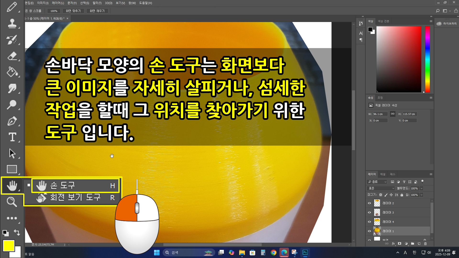 또, 확대된 이미지를 섬세하게 작업하기 위해서는 손바닥 모양의 [손 도구]를 같이 사용합니다.