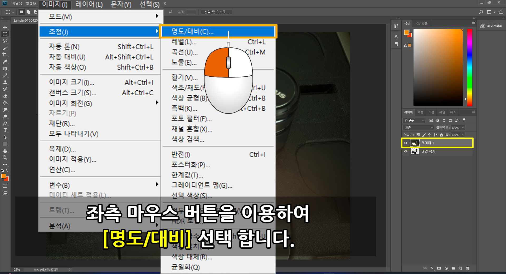 우선 [레이어 박스]에 어두운 이미지 레이어가 지정되었는지 확인하고, 화면 상단 [메인 메뉴바]에 [이미지]로 이동하여 [조정]을 눌러 돌출된 옵션창에 [명도/대비]를 선택합니다.