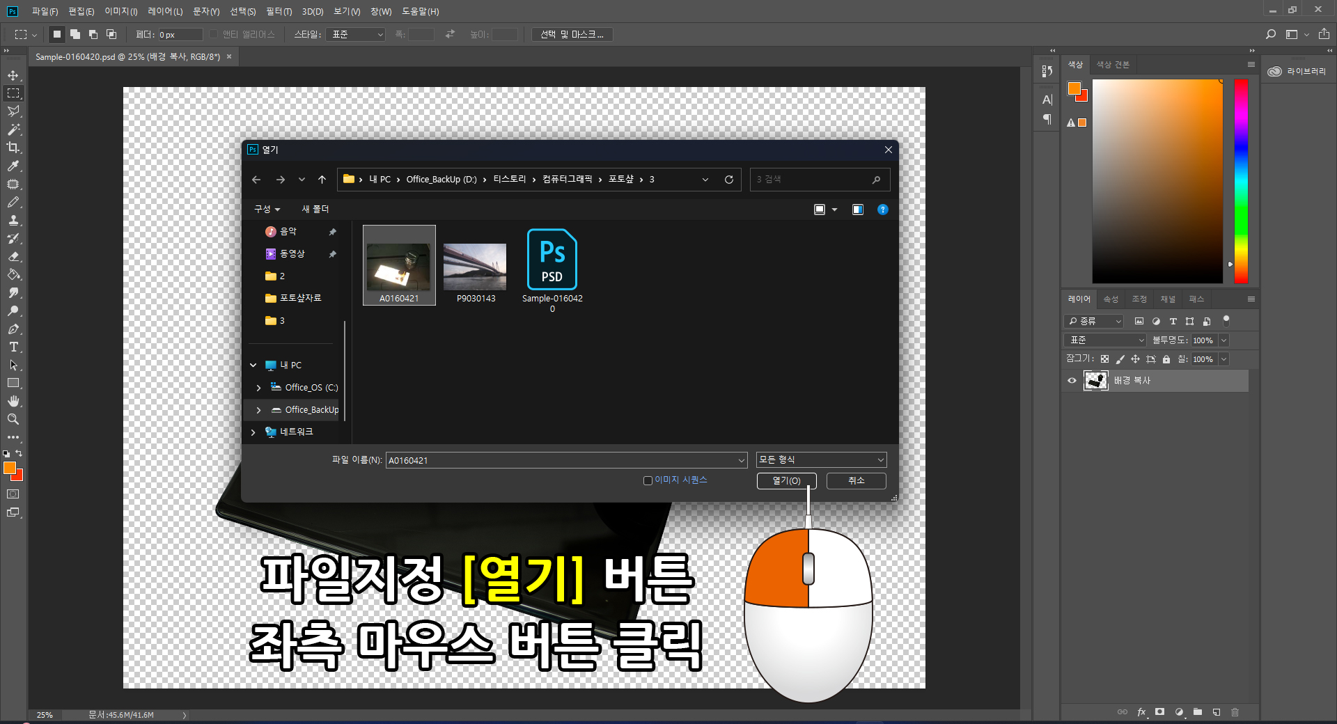 돌출된 열기창에 앞서 작업하여 저장한 파일(Sample-0160420.png)을 지정 후. 화면의 [열기] 버튼을 클릭합니다.