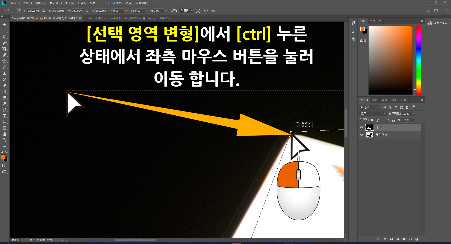 [선택 영역 변형] 사각표시 모서리 한 부분에 마우스스 커서를 올리고, 키보드 자판 [ctrl] 버튼을 누른 상태에서 좌측 마우스 버튼을 눌러 핸드폰 액정 모서리 부분으로 이동합니다.