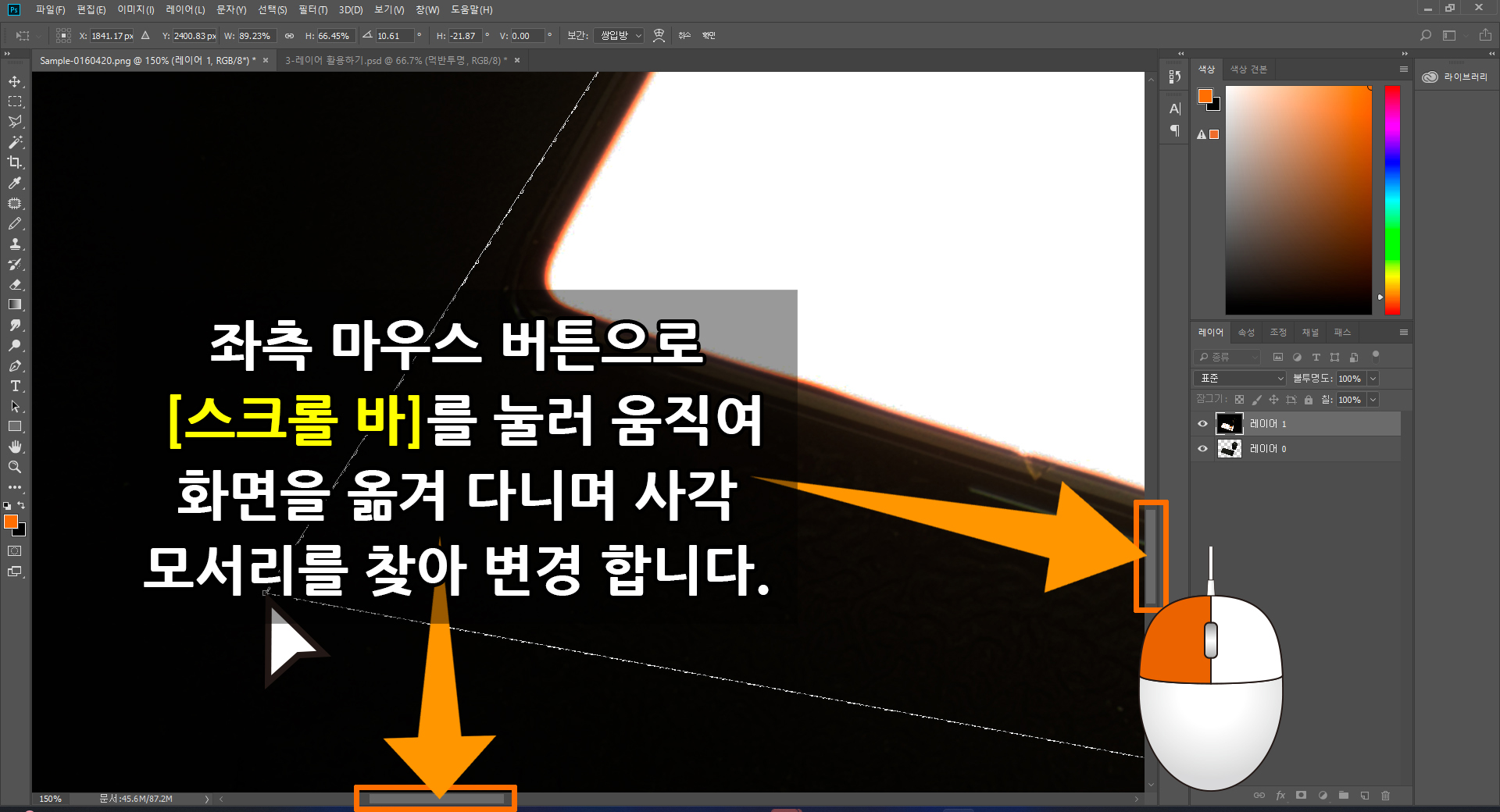 화면 좌측 [툴박스]에 위치한 [돋보기]와 [손 도구]를 이용하여 핸드폰 액정 모서리를 확대 이동하여 액정 모서리 네 곳의 곡선 구간을 지정된 영역에서 배제하여야 합니다.