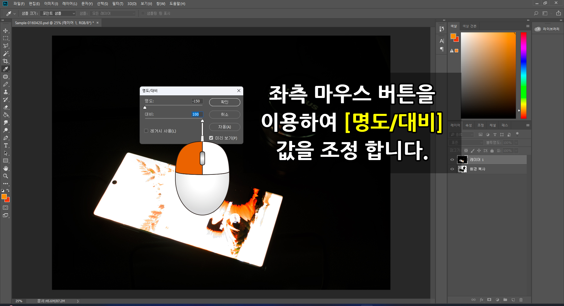 2. [명도/대비]를 이용한 핸드폰 액정과 테두리 구분하기(핸드폰 액정만 오려내기)