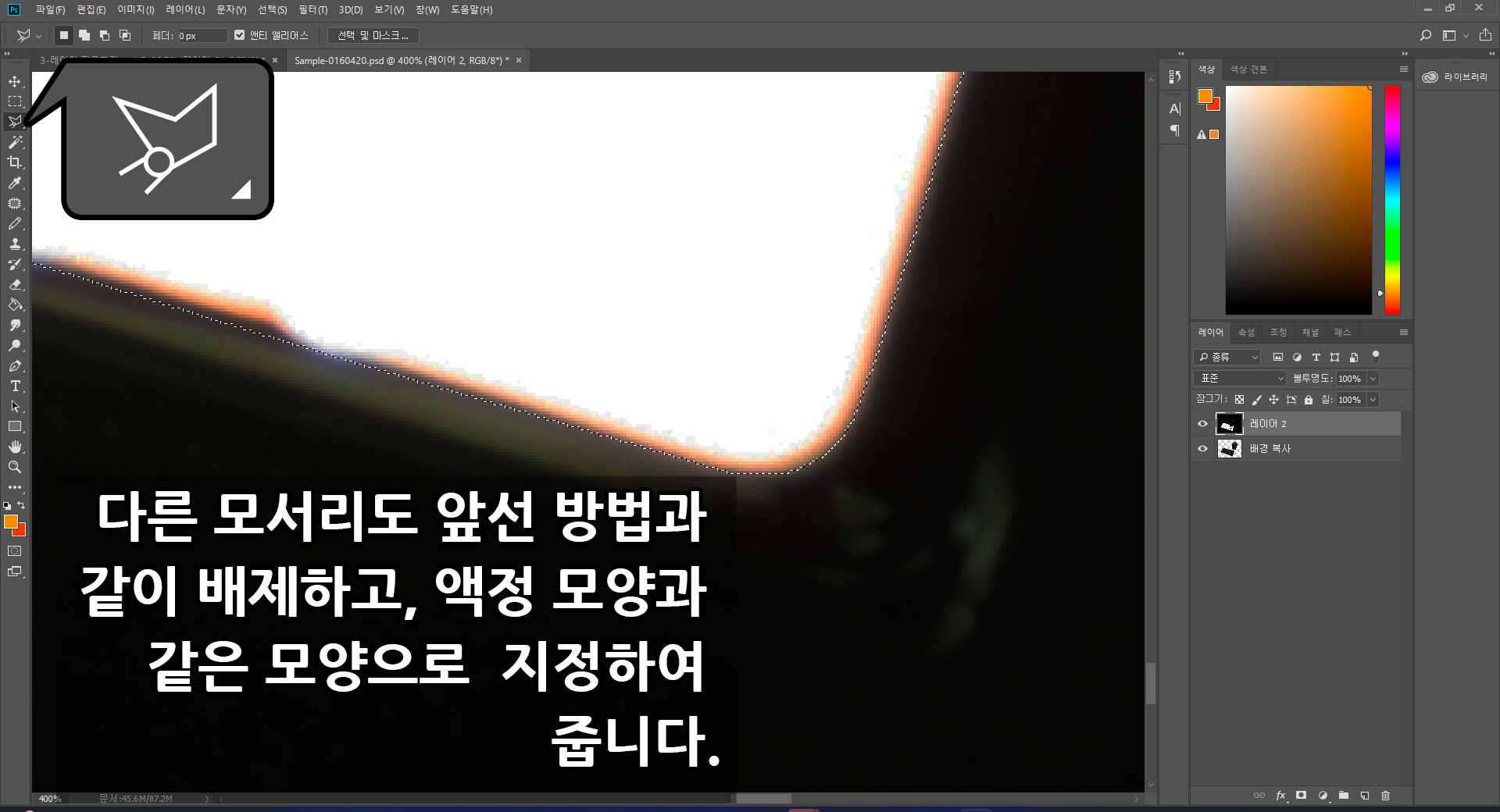 핸드폰 액정의 모서리 네 곳을 모두를 같은 방법으로 선택 영역에서 배제한 후. [레이어 박스]에 두 개의 레이어 중 하단에 위치한 [레이어]를 좌측 마우스 버튼으로 선택 지정하고 키보드 자판의 [delete] 버튼을 눌러 삭제, 제거할 예정으로 영역을 정상적으로 선택되었는지 [다음 4.]와 같이 확인합니다.