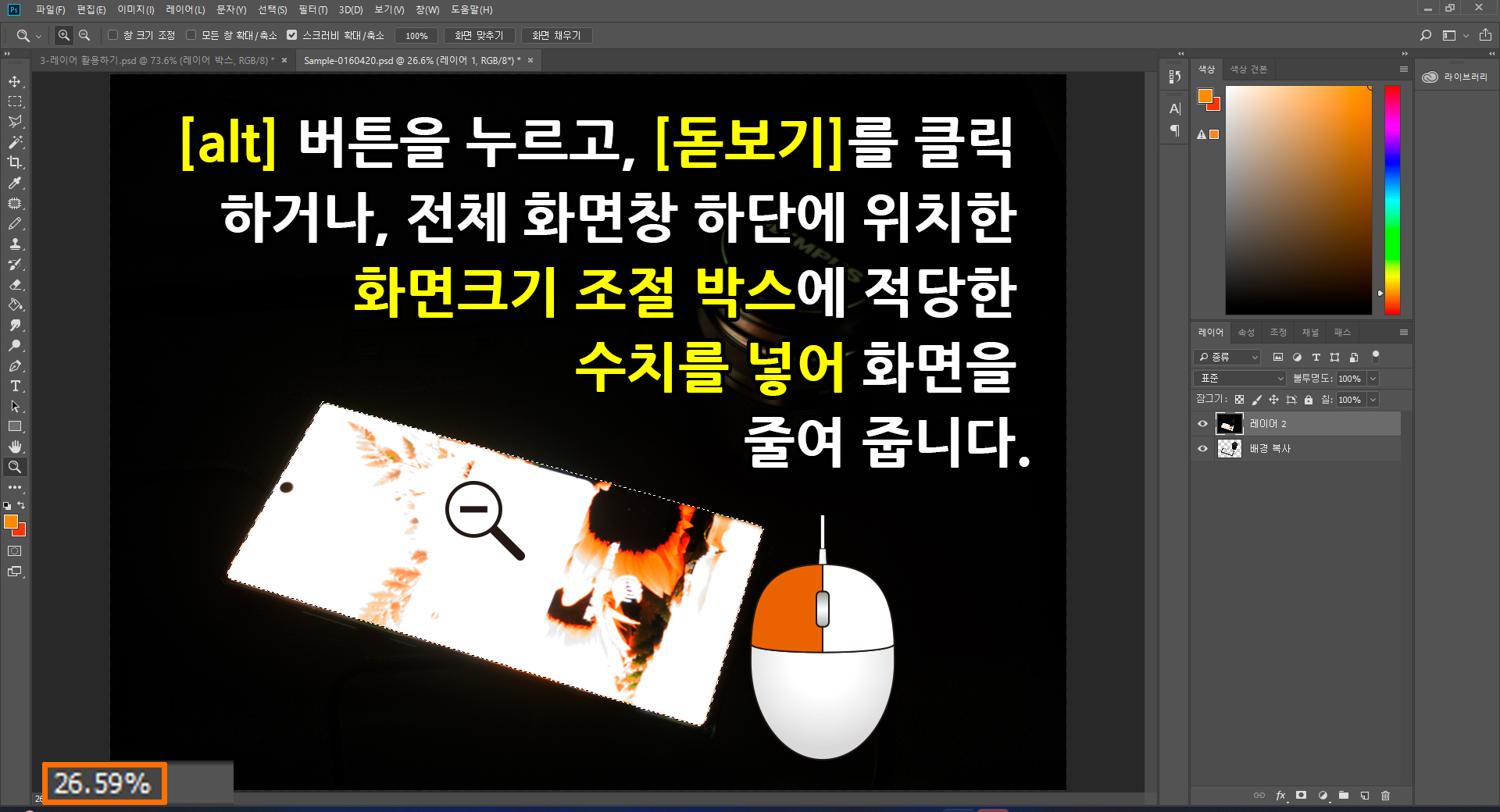 키보드 자판 [alt] 번튼을 누른 상태에서 [툴박스]에 위치한 [돋보기] 도구 선택한 후. 키보드 자판 [alt] 버튼을 누른 상태에서 좌측 마우스 버튼을 이용하여 화면을 축소합니다. 액정 전반이 지정 영역에 확보되었는지를 확인하고 [레이어 박스]에서 두 개의 레이어 중 하단 위치한 원본 레이어를 클릭하여 키보드 자판 [delete]를 눌러 원본의 액정 부분을 지워 줍니다.(빈 공간) [레이어 박스] 상단에 위치한 어두운 레이어를 [레이어 벅스] 하단에 위치한 쓰레기통 모양의 [삭제] 아이콘을 눌러 삭제합니다.