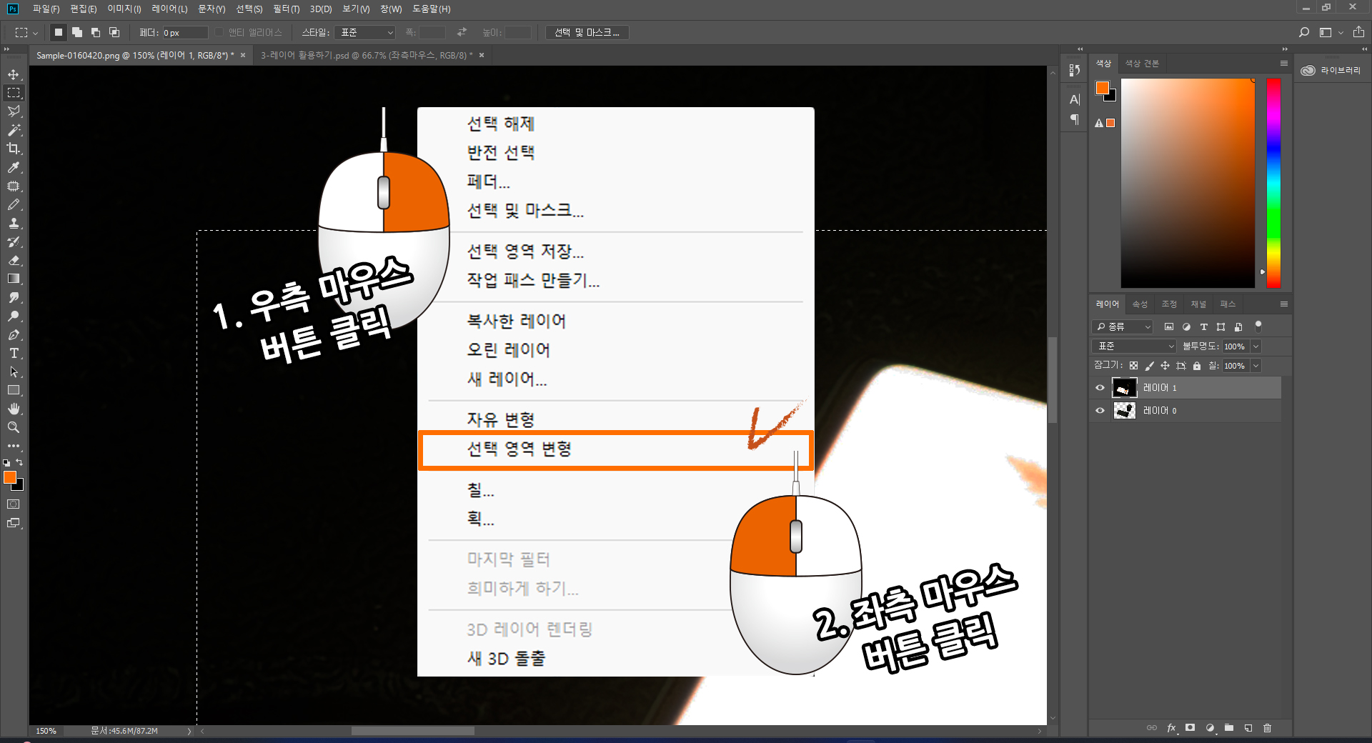 지정된 사각에 우측 마우스 버튼을 누르면 [숨겨진 추가 옵션] 창이 나타납니다. [선택 영역 변형]을 좌측 마우스 버튼을 눌러 선택합니다.