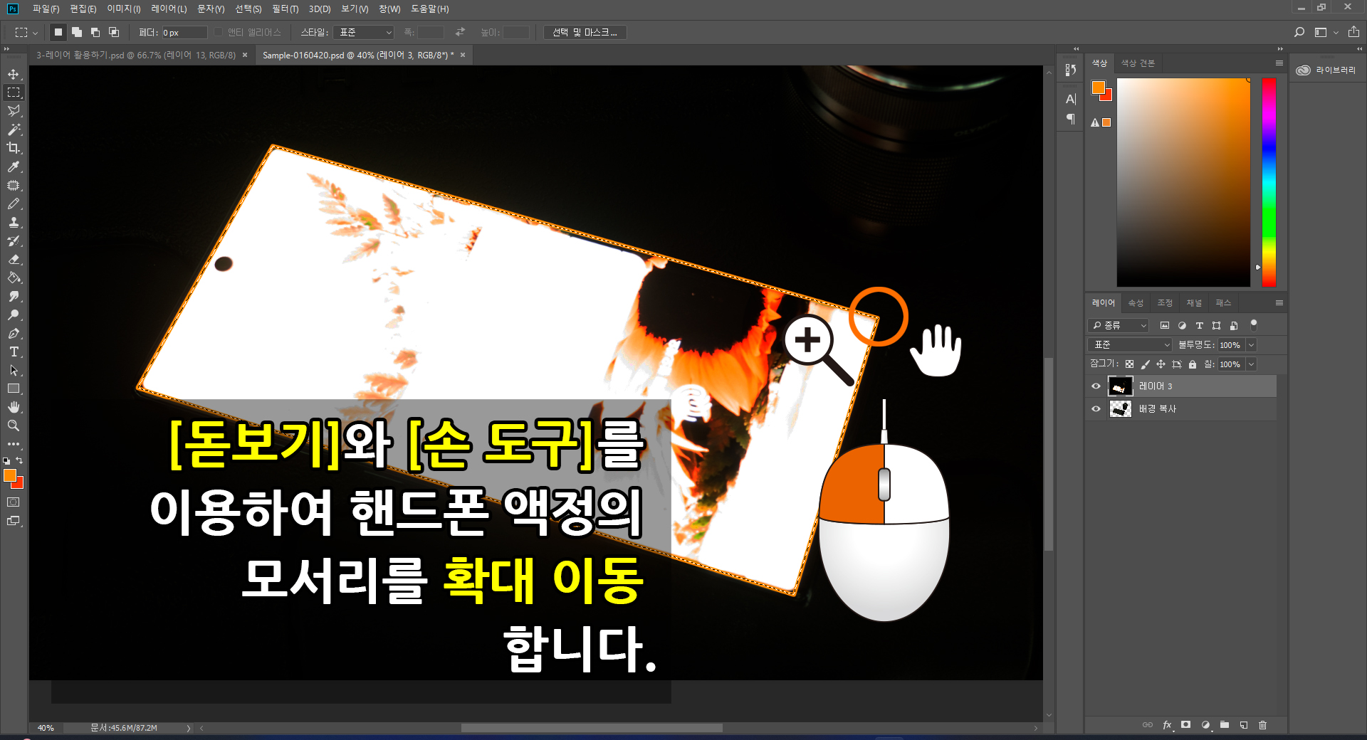 화면을 [돋보기]를 이용하여 화면을 확대하고, 선택된 사각 모서리의 한 곳과 그에 가장 가까운 핸드폰 모서리가 한 화면에 보이도록 [손 도구]를 이용하여 이동합니다.
