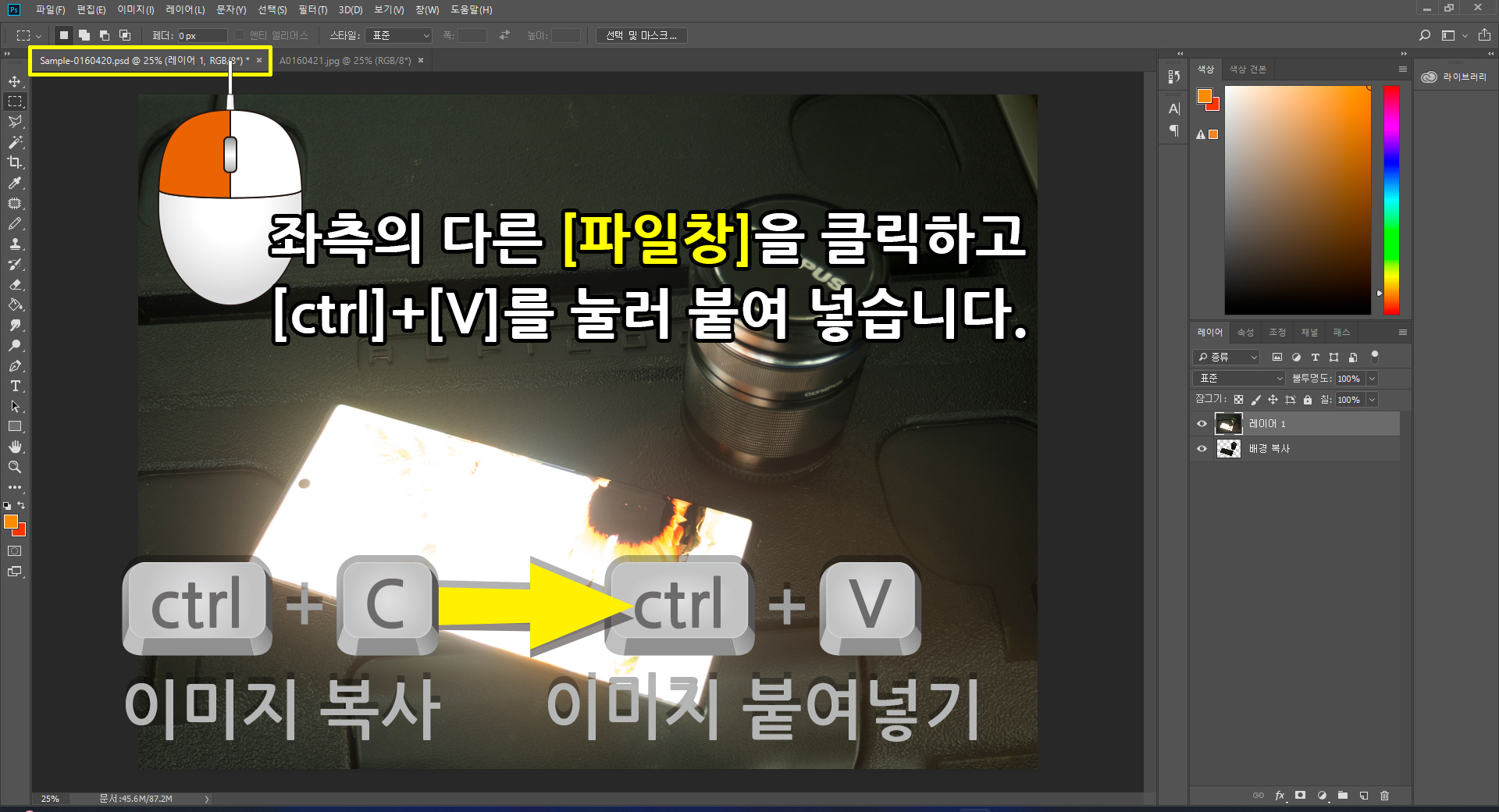 지정된 영역의 이미지를 키보드 자판 [ctrl]+[C]를 눌러 복사 후. 마우스 커서를 앞서 불러온 Sample-0160420.png [파일창] 또는 [문서창]을 좌측 마우스 버튼으로 지정하고, 키보드 자판 [ctrl]+[V]를 눌러 붙여 넣기를 합니다.