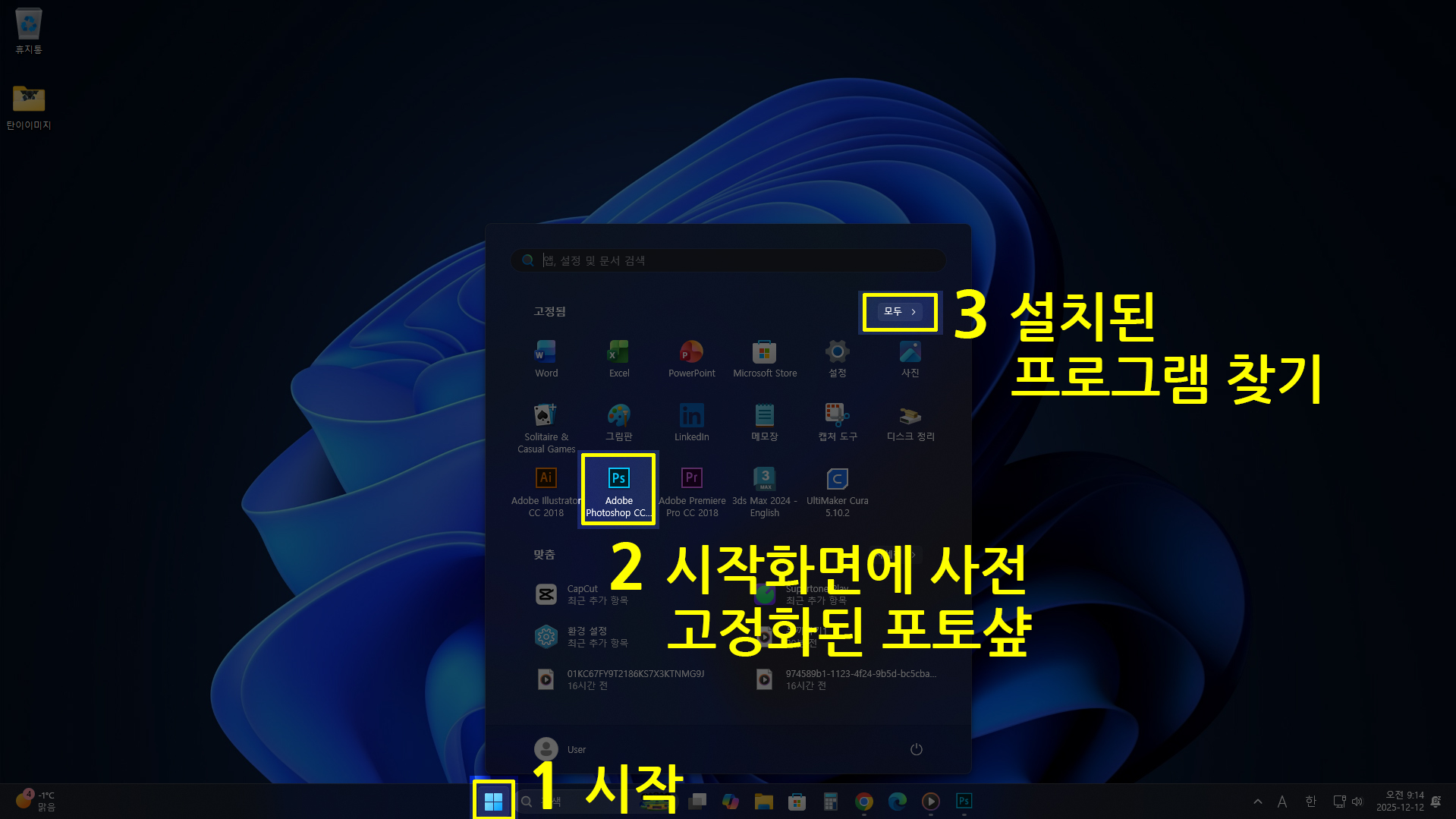 본 내용에 앞서 마우스 사용법에 대해 간단히 안내 하겠습니다. 샘플 이미지 다운로드 [ 버전은 달라도 포토샵의 기초와 원리는 변하지 않습니다! ] 윈도우 시작 아이콘부터 작업파일 열기 1. 윈도우 바탕화면에 [시작] 아이콘 클릭2. 포토샾 아이콘을 시작화면에 고정한 경우. [포토샵 아이콘] 바로 클릭3. 그렇지 않은 경우는 [시작] 화면에서 설치된 프로그램을 우측의 [모두] 버튼을 눌러 찾아들어갑니다. 4. [포토샵 아이콘]을 클릭하여 포토샵을 실행합니다. 5. 상단 가로 [메인 메뉴바]에 [파일] > [열기]를 클릭합니다. 열기창에서 작업할 이미지를 좌측 마우스 버튼을 이용하여 [선택] 합니다. 1회 클릭은 선택, 두 번(더블) 클릭은 [열기] 열기창의 아이콘이 작아 구분이 어려운 경우를 고려..